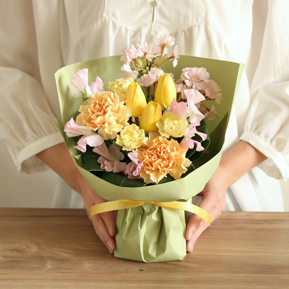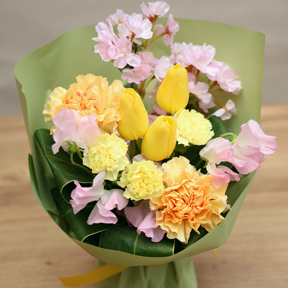 やわらかな春のひだまりのような黄色いチューリップと、優しいピンクの花々に桜を添えました。桜はつぼみの状態でお届けしますので、徐々に開花していく様子をお楽しみいただけます。