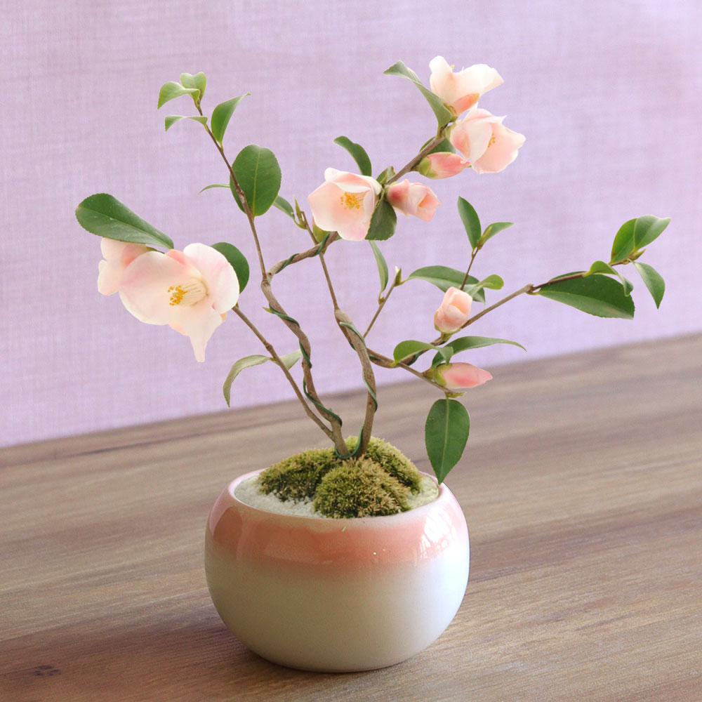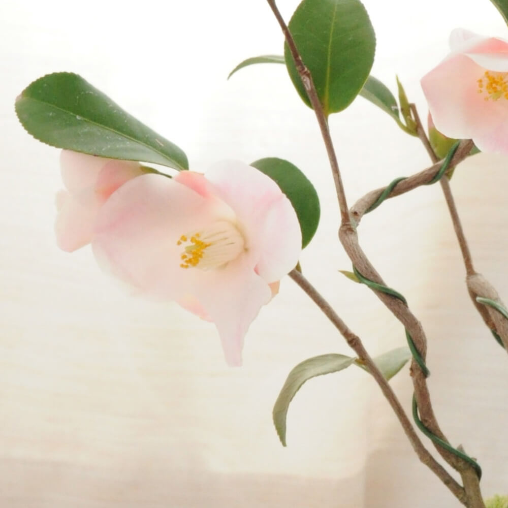 | 花材 | 香り椿(春風)、苔 ※観賞用なので食べられません。小さなお子様やペットが食べないようご注意ください。 |
