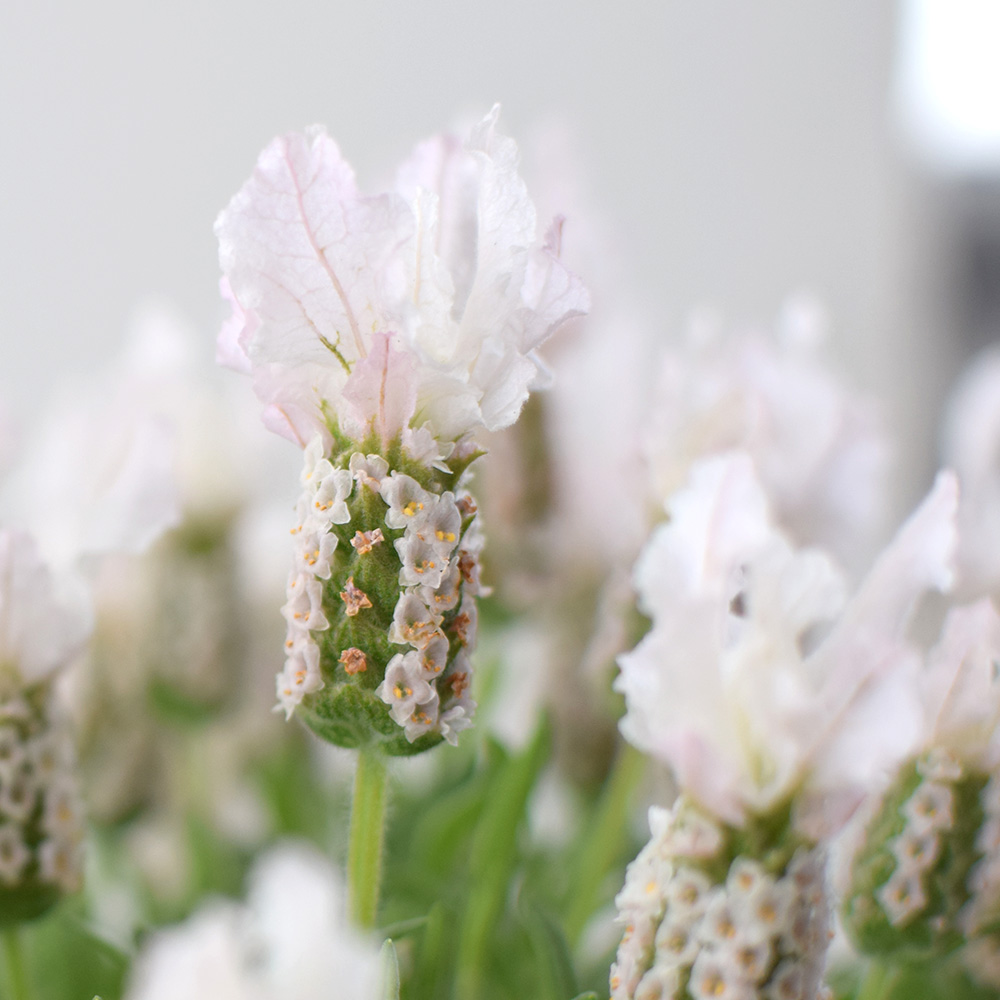 優雅な香りと純白の美しさで人気のラベンダー(ピュアホワイト)。ウサギの耳のような可愛らしい苞葉(花の周りにある葉が変形したもの)が特徴です。