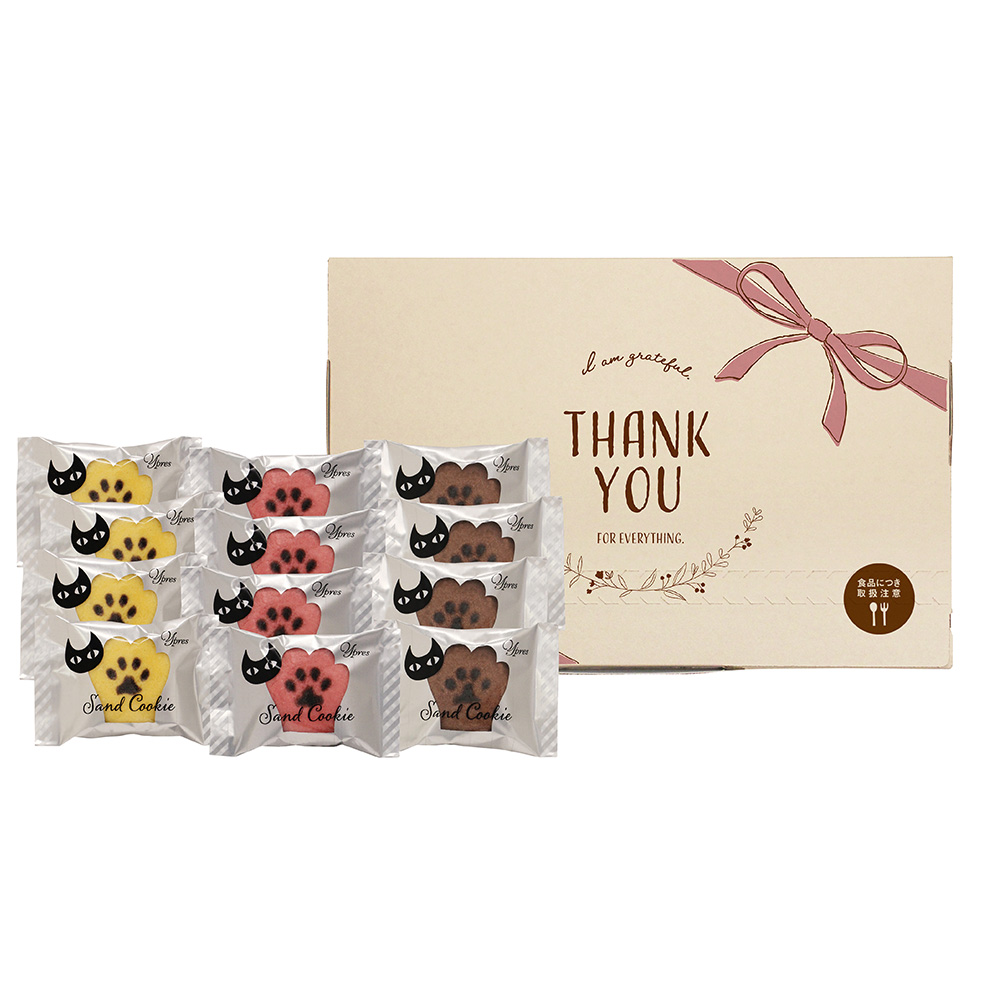 ネコの可愛らしい肉球の焼き印がついた、ころんとしたサンドクッキーです。猫の手のかたちの窓がついた個包装は猫好きの方だけでなく皆さんで楽しんでいただけるかわいらしさです。