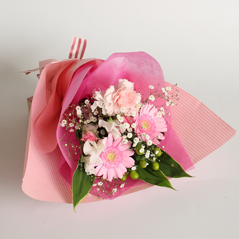 | 花材 | ガーベラ×2本、カーネーション×1本、スプレーバラ、スイートピー、ヒペリカム、カスミソウ、ドラセナ |