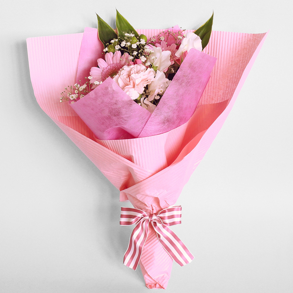 一緒にお届けするのは、春らしい色合いでまとめたガーベラとカーネーションがメインの花束です。お子様の卒入学や異動、季節のご進物など、春にピッタリな贈り物です。