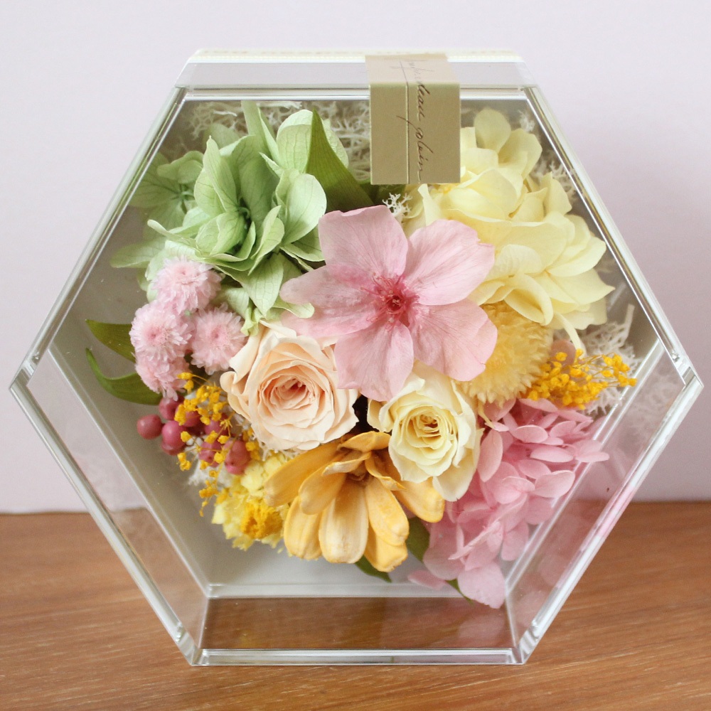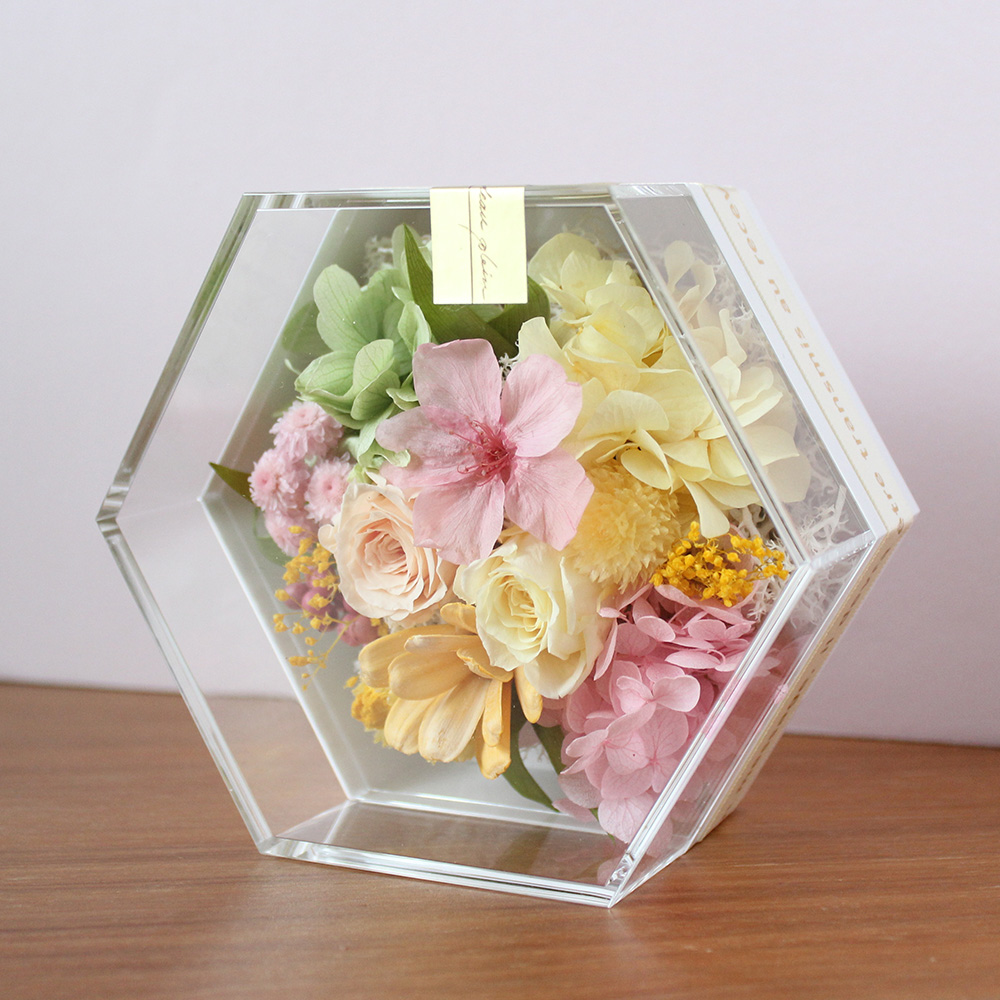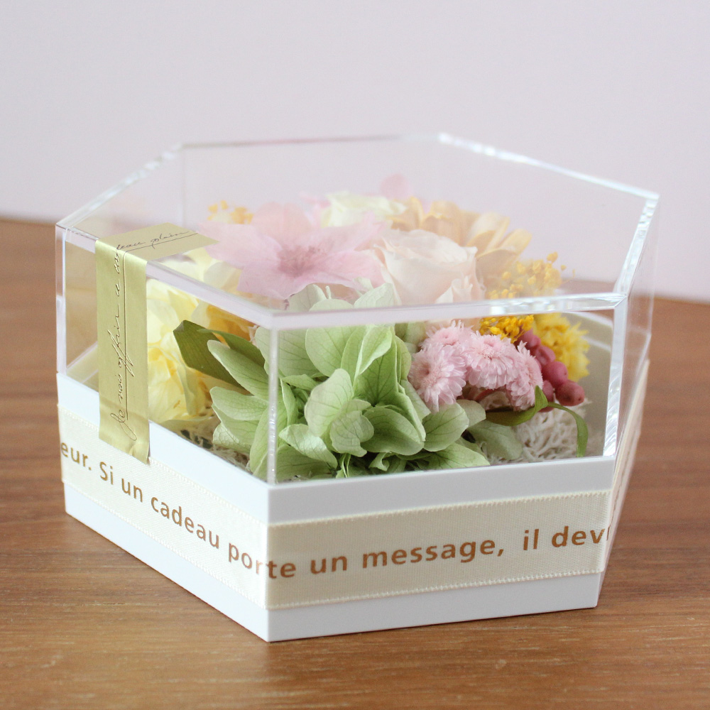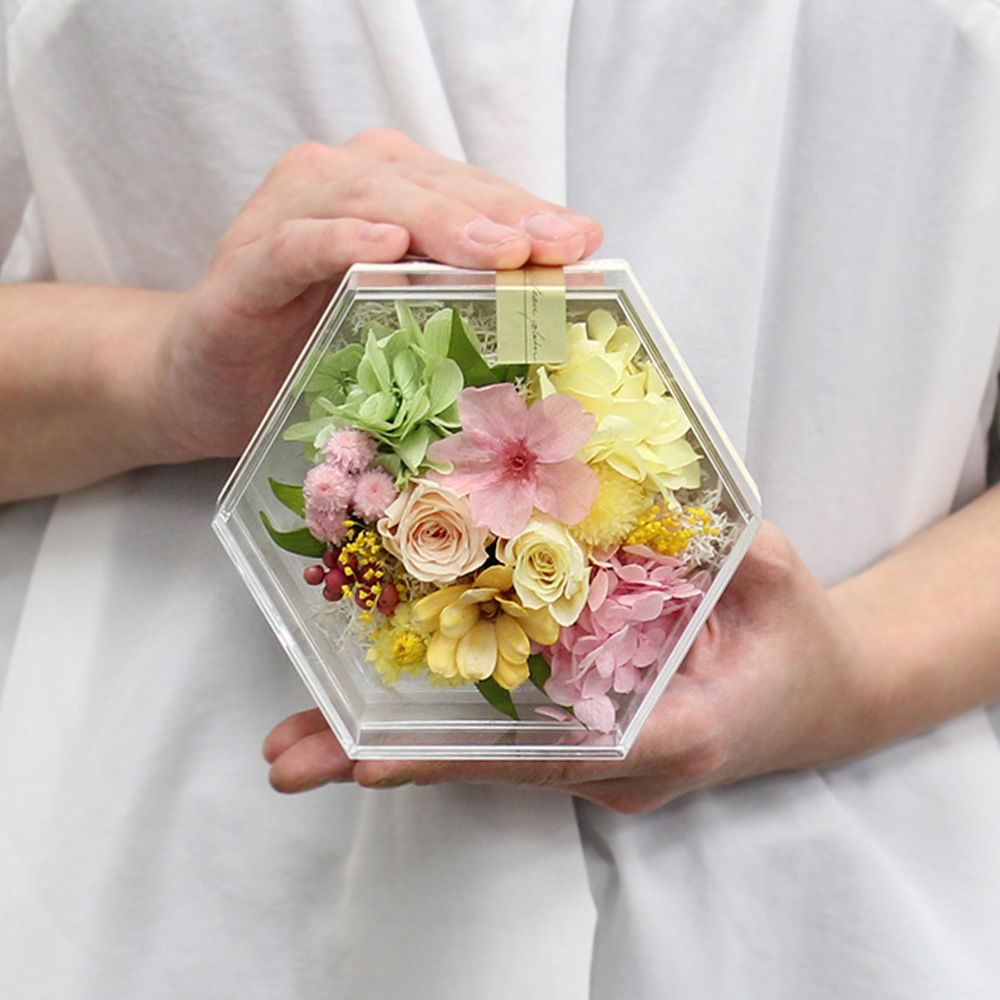 大切な人の新しい門出や、日頃の感謝を伝える春。誰もが心ときめく「桜」を、六角形(ハニカム)のケースに閉じ込めた、季節限定ギフトです。桜のプリザーブドフラワーを中心に、ミニバラやアジサイ、小花が優しく重なり合うデザイン。調和と安定、幸福をもたらすとされる六角形をモチーフとした器は、立てても寝かせても飾れる2way仕様です。蓋付きで、お手入れの手間もかかりません。