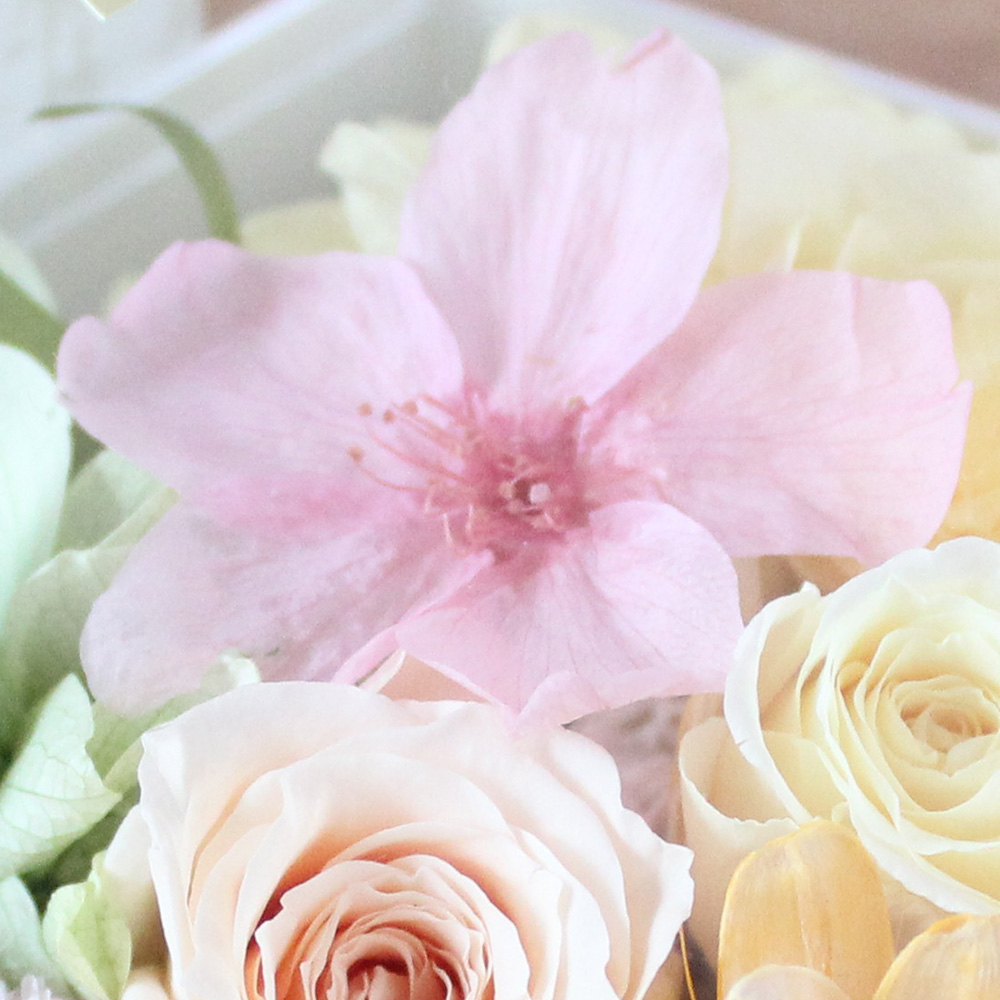 | 花材 | プリザーブドフラワー:桜、ミニバラ、センニチコウ、カスミソウ、ペッパーベリー、アジサイ、グリーン、モス ドライフラワー:プチフラワー、イモーテル、アンモビューム |