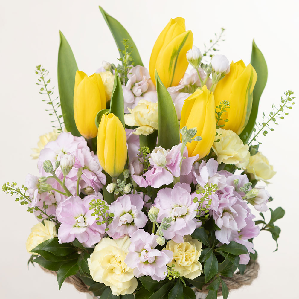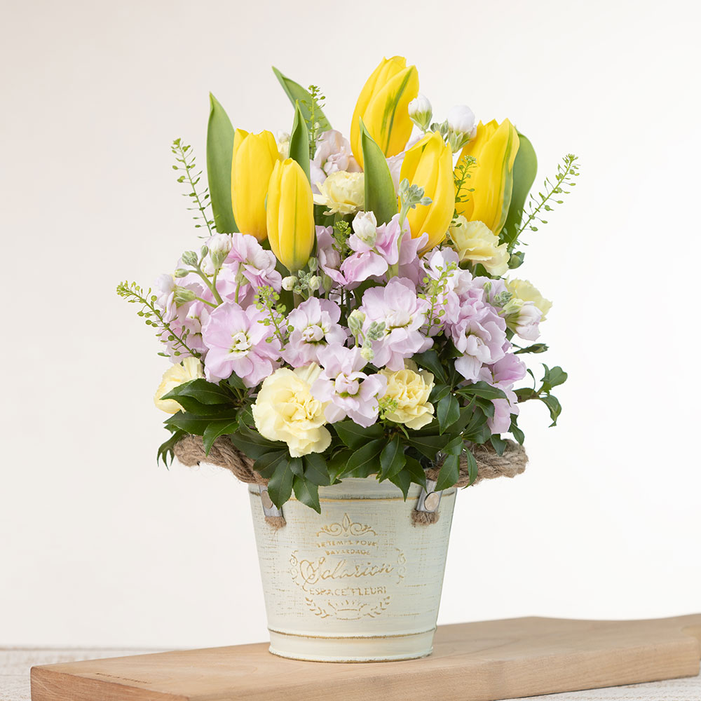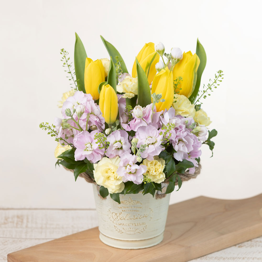 お洒落なブリキに元気が出るイエローのチューリップや春の花ストックなどを詰め込んだアレンジメント。ピンクとイエローの組み合わせは、春の到来を感じさせる明るく軽やかな配色です。