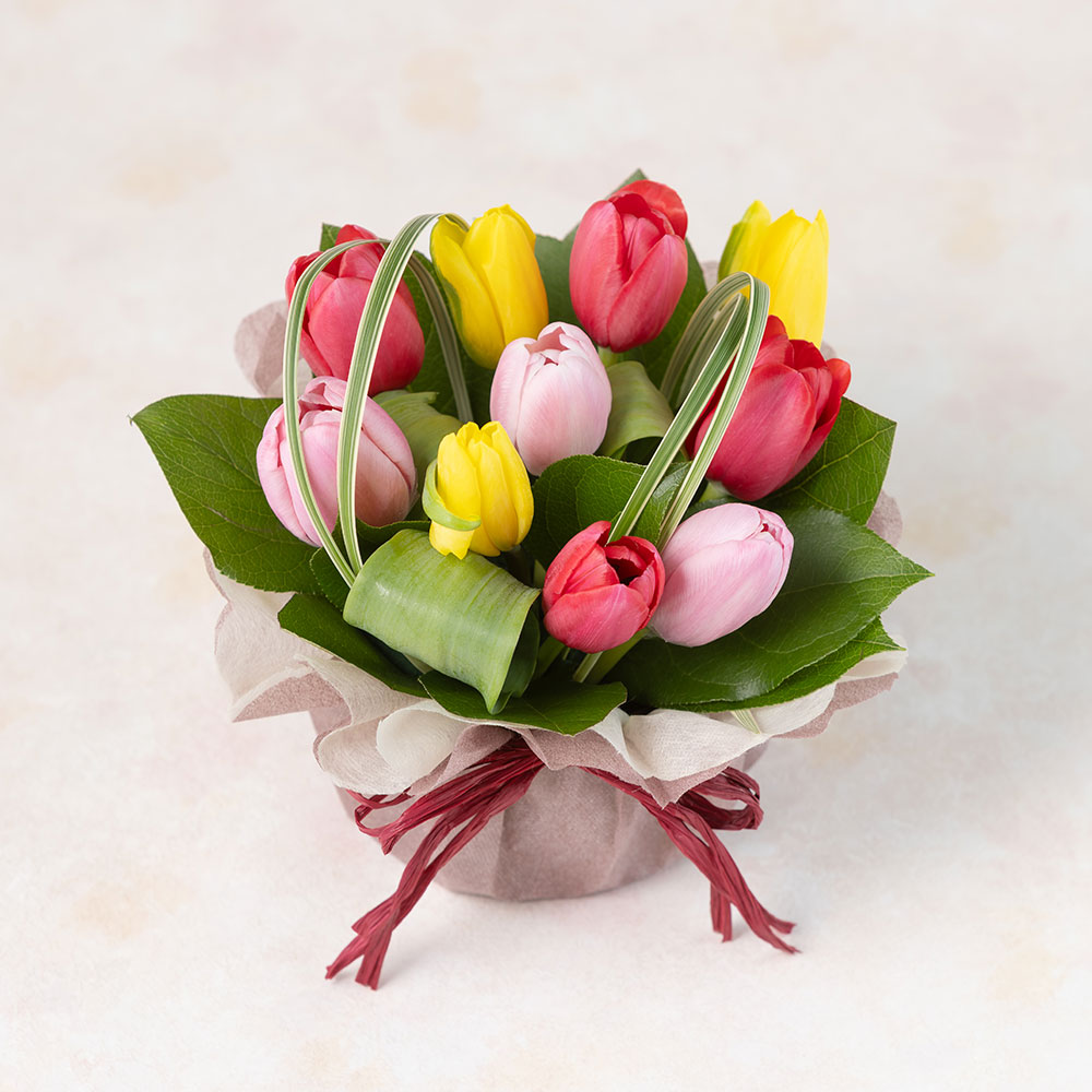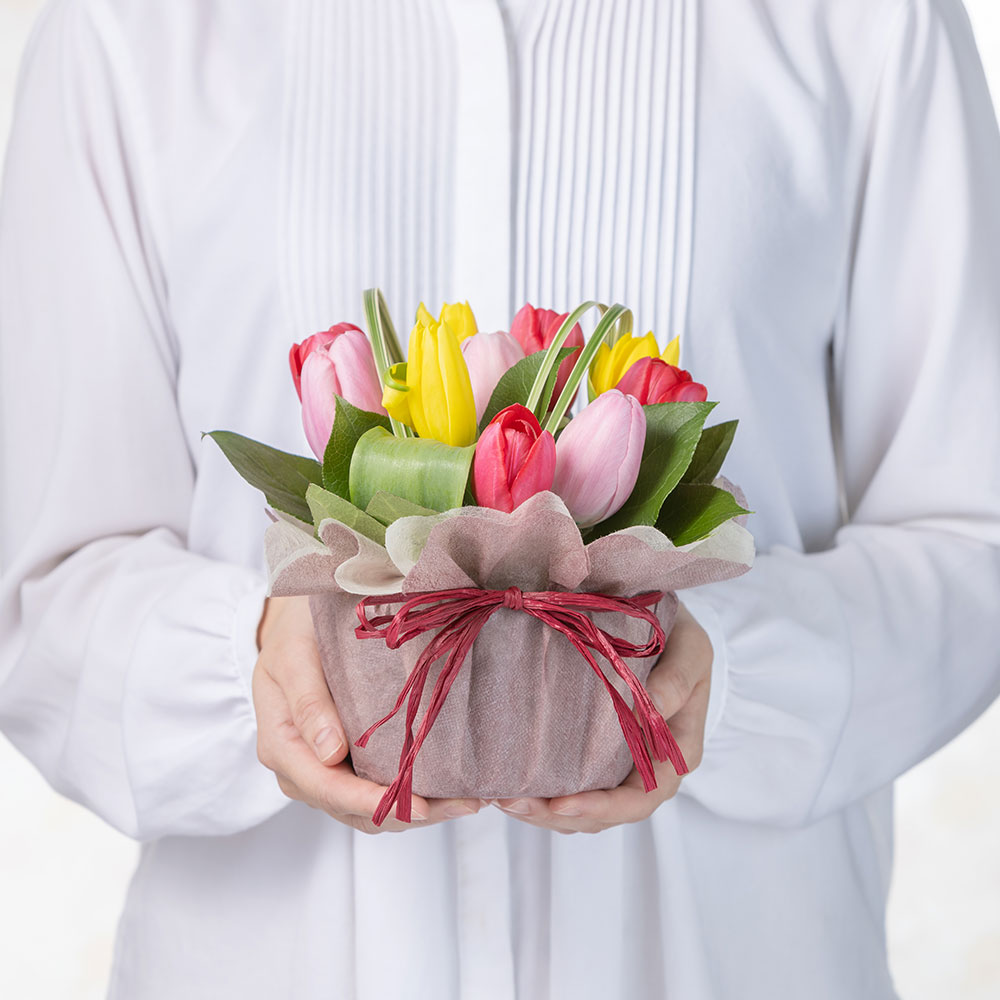 カラフルな花色は、まるで花屋さんの店先に並ぶ色とりどりのチューリップから好きなものを1本1本選んだような春いっぱいのアレンジメントです。温かみのある色のラッピングにキャンディーみたいな色合いのチューリップをギュッと詰めこみました。