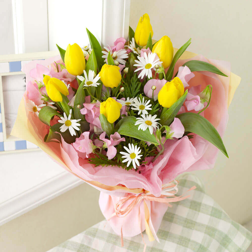 気配を感じただけで幸せな気持ちになる春。黄色のチューリップと白いマーガレット、そしてピンクのスイートピーの組み合わせが、そんなウキウキ感をそのまま表現してくれます。春に訪れる様々な「おめでとう」のギフトとして、また幸せ気分を満喫するためのマイギフトとしてお楽しみください。