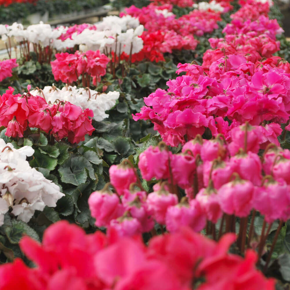 周囲を山々で囲まれた冷涼な気候を生かし、四季折々の鉢花を栽培している登坂園芸。愛情込めて育てられたシクラメンの中からボリューム感のあるものを厳選してお届けします。登坂園芸のシクラメンは自然開花のため、5月頃まで次々と花が咲き続けます。