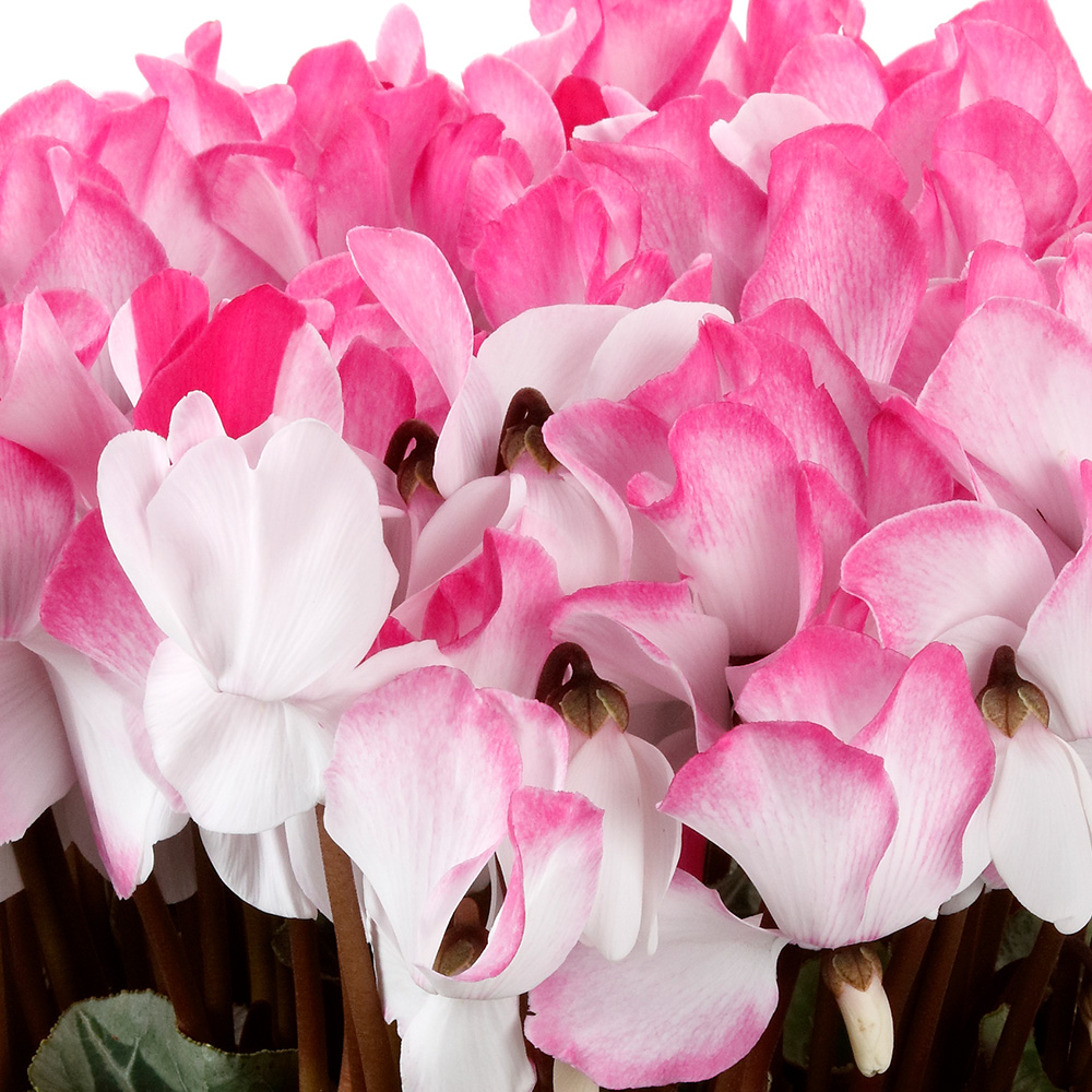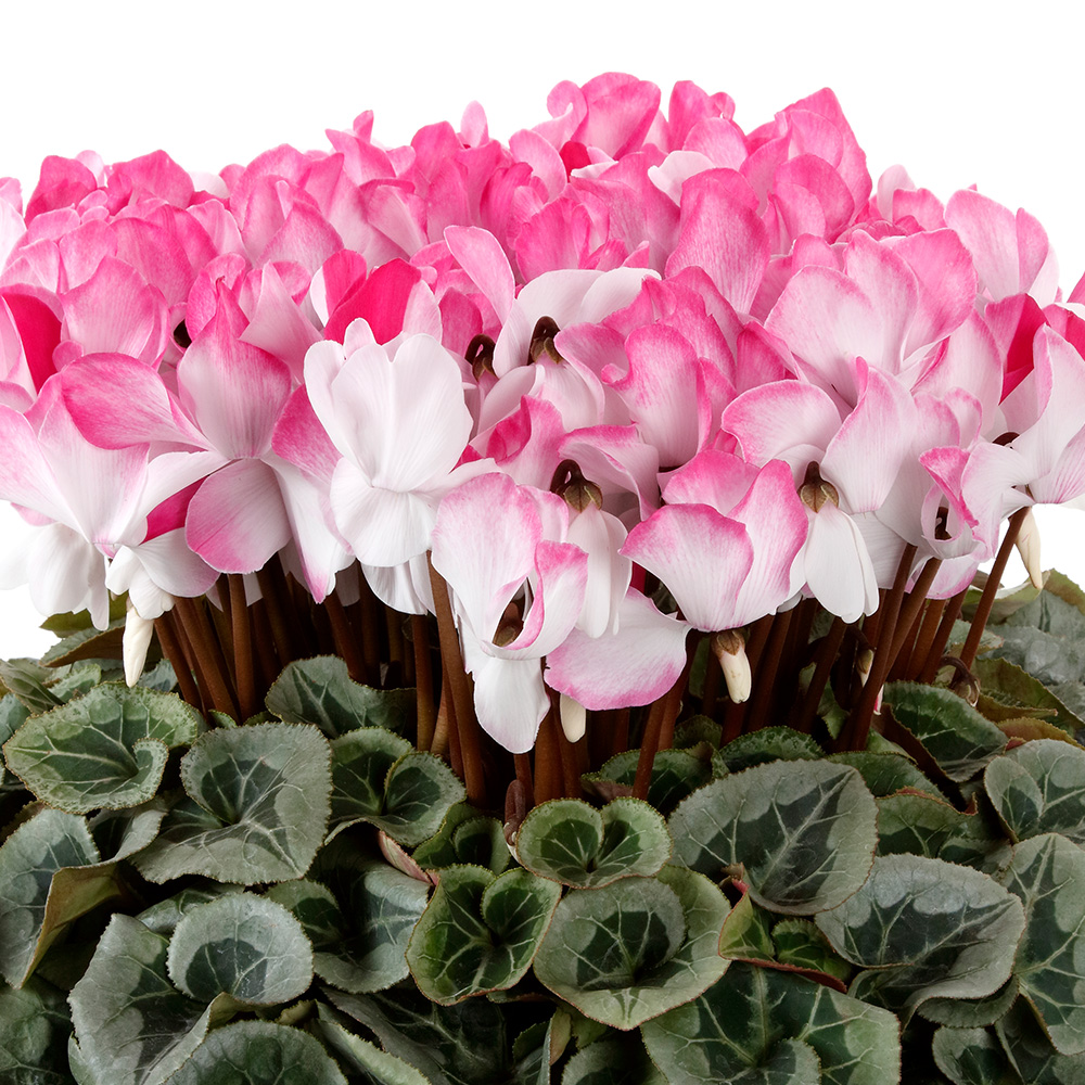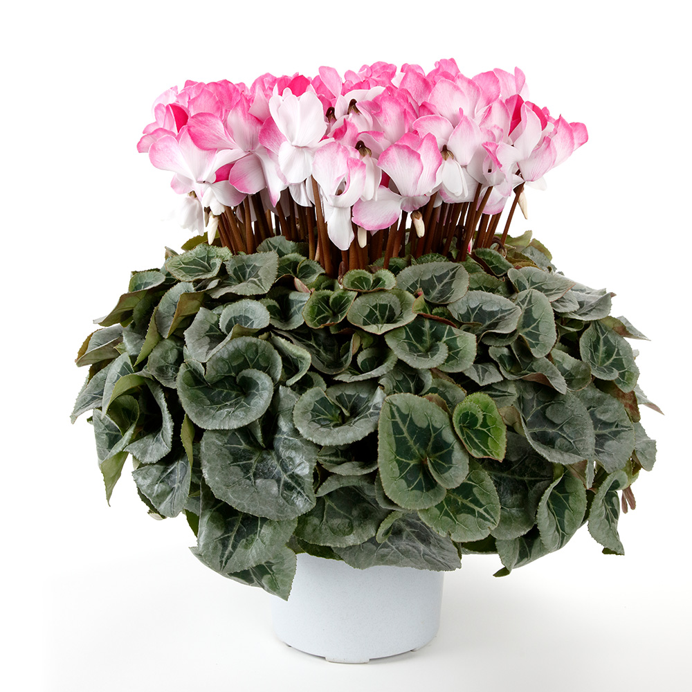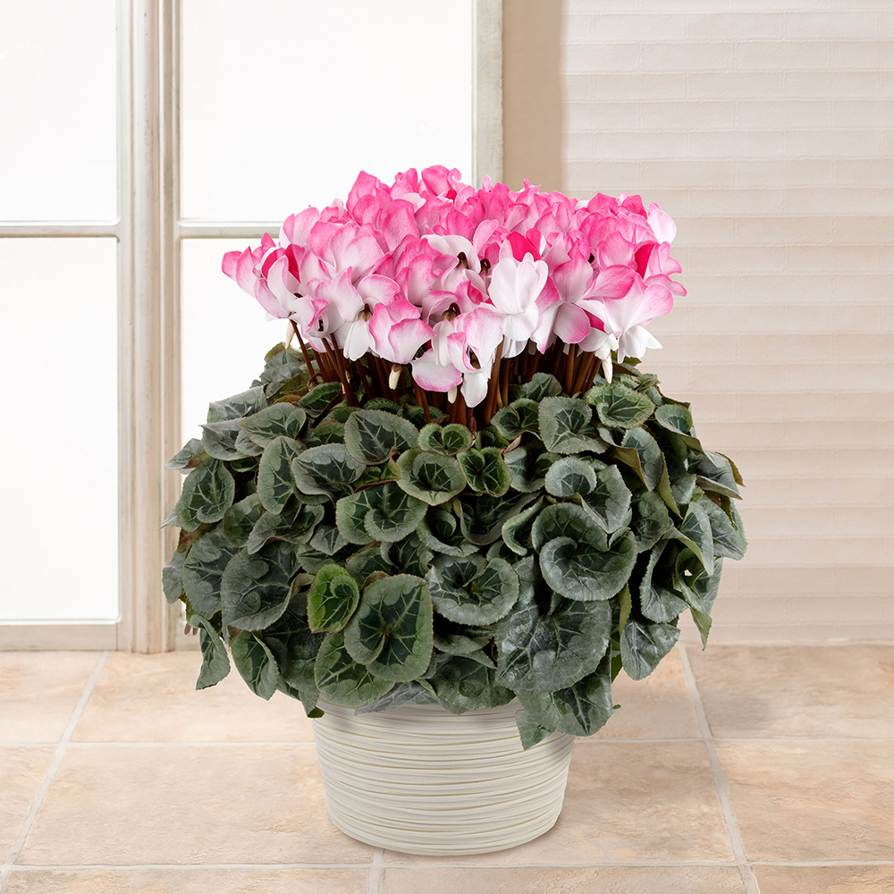花先からピンクにのグラデーションの人気のシクラメンです。咲き進むにつれてピンクに色づいていきますが、日当たりや気温によってピンクの濃淡に変化がでます(紫外線が多く、温度が低いとより発色が美しくなります)。
