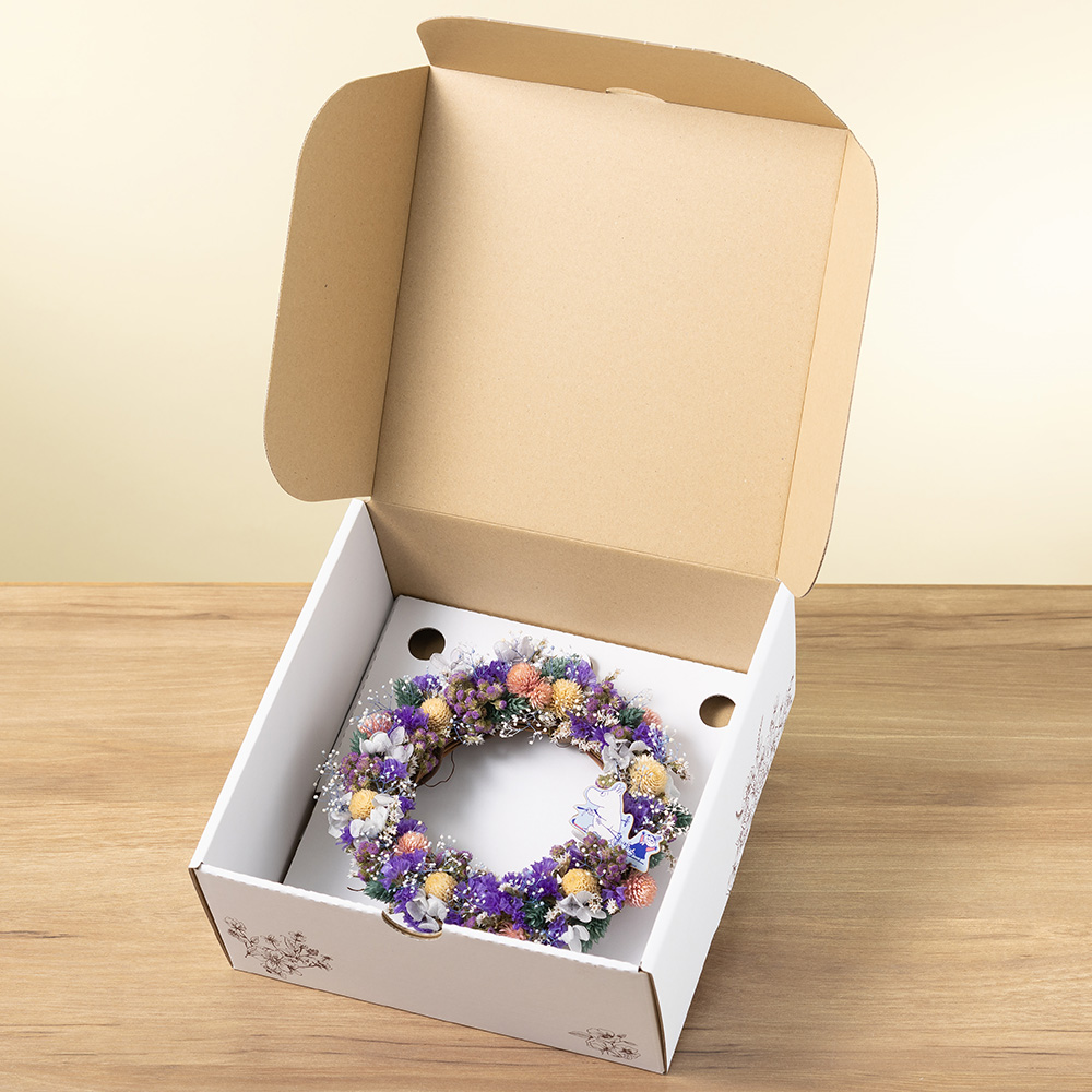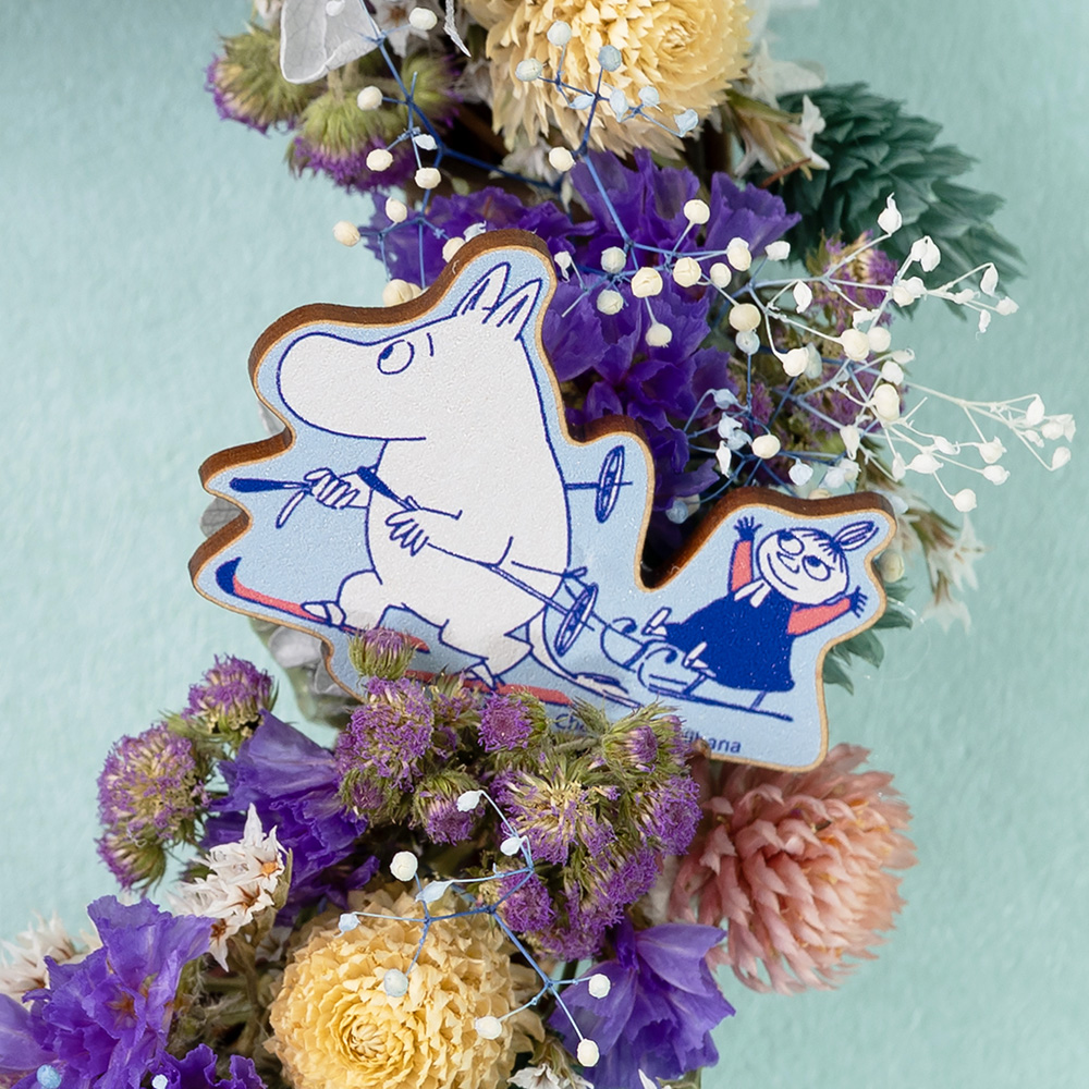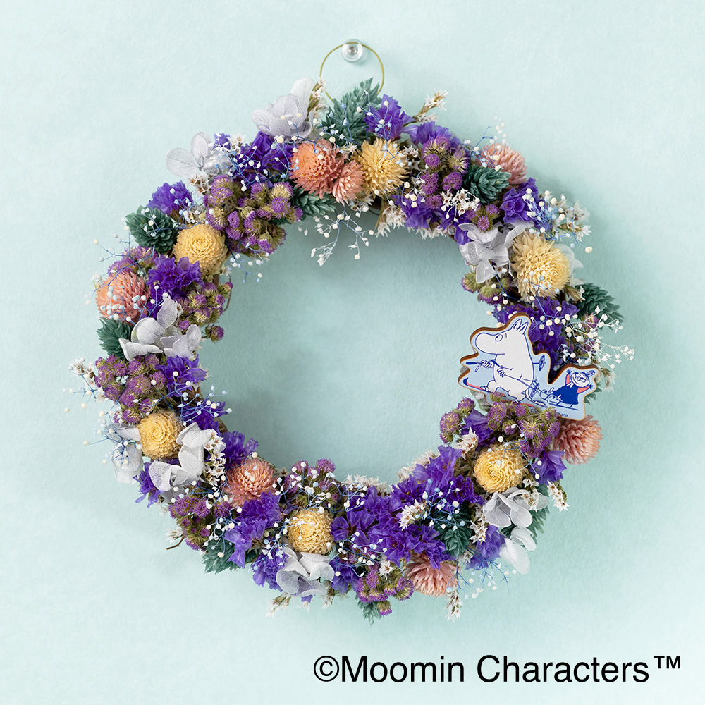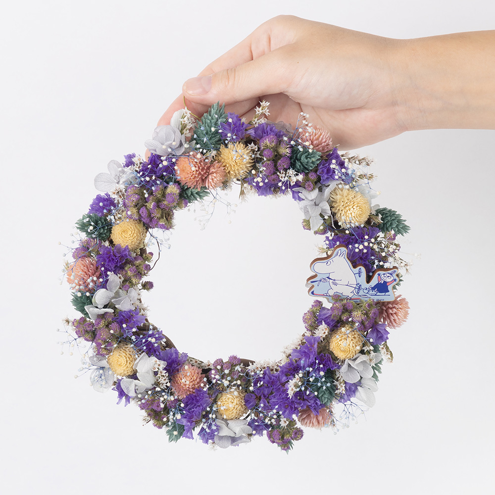 北欧の名作「ムーミン」の世界観を込めた、「SNOWY WAY HOME(雪の帰り道)」をテーマにしたアートを用いた特別なドライフラワーリースです。リースにはソリに乗って家路を急ぐムーミンとリトルミイのアートプレートが入っており、見る人の心を和ませます。玄関やリビングに飾れば、心温まる冬の雰囲気をお楽しみいただけます。