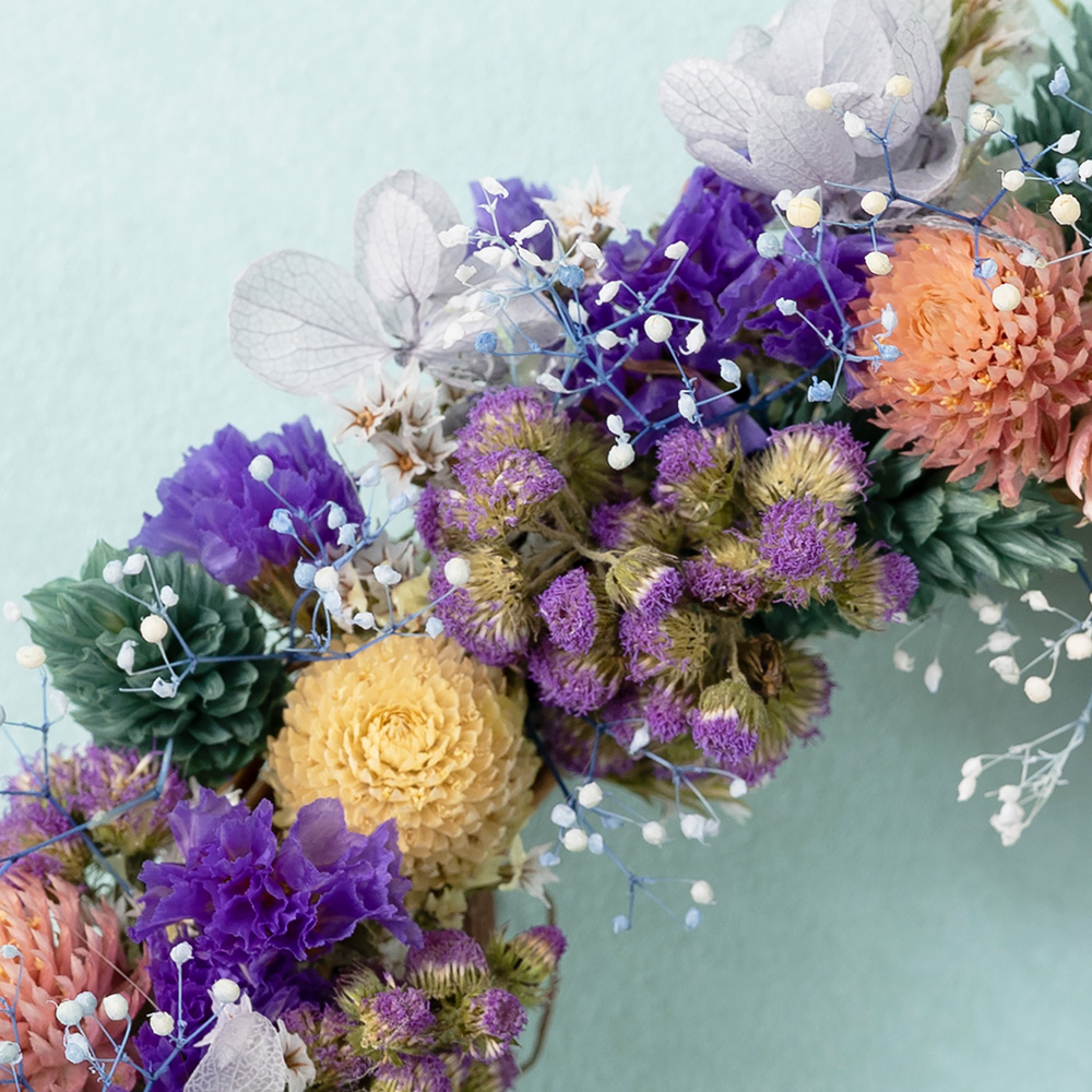 クールなパープルリースは、濃紫のスターチスとアゲラタムをメインに、白とピンクの千日紅が雪玉のようなアクセントを添えます。水色のアジサイと白いかすみ草で、夜の静寂と雪景色を演出しました。