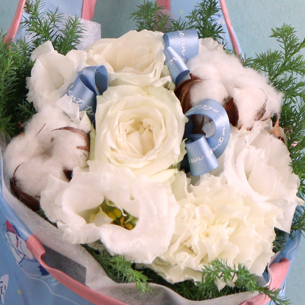 淡いブルーのエコバックには、白いバラやカーネーション、トルコキキョウに温かみを感じるコットンフラワーを組み合わせて、一面の雪景色を表現しました。