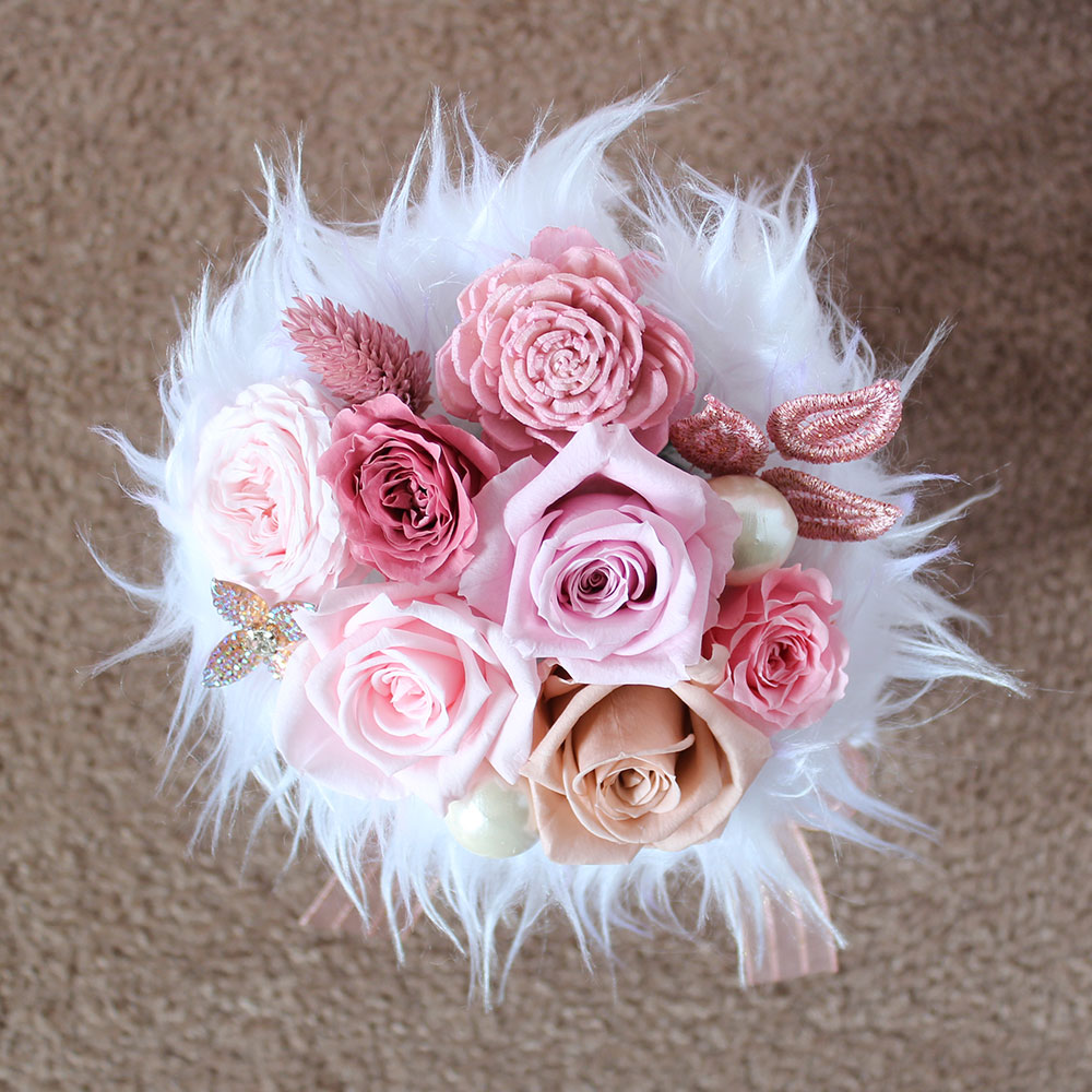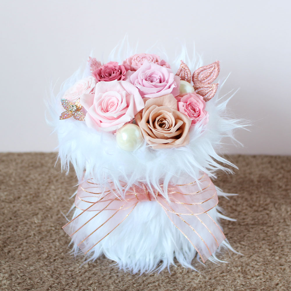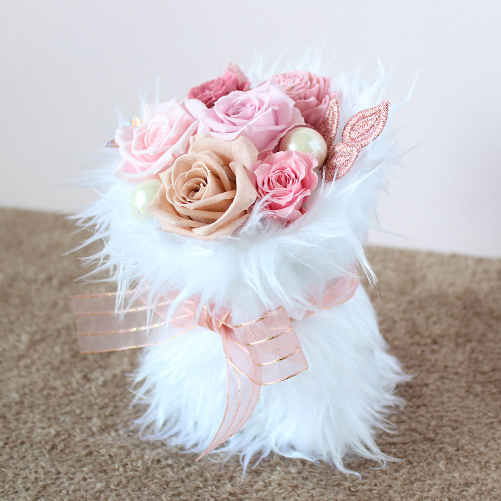 白いふわふわのファーででくるまれた、ウィンターシーズンならではの贈り物。淡いピンクのバラをたくさん使い、キラキラとした素材を組み合わせ、まるでブーケのように中央をキュッとリボンで結んだデザインです。