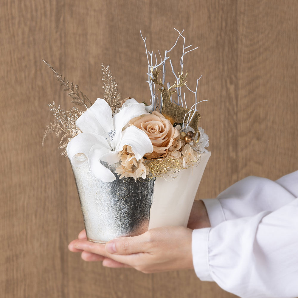 | 花材 | プリザーブドフラワー:カサブランカ、バラ、アジサイ、ヒムロ杉 ドライフラワー:小枝 アートフラワー:ゴールドリーフ各種 |