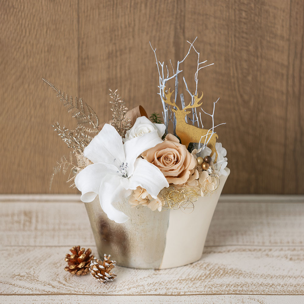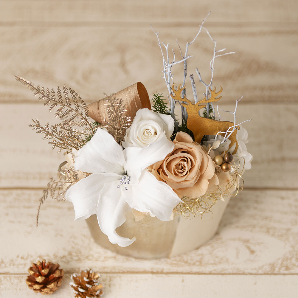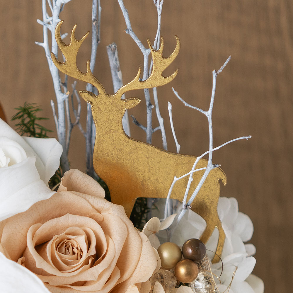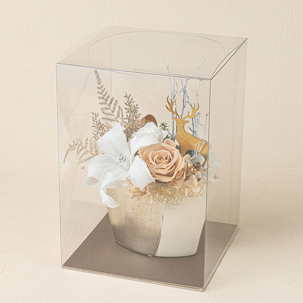 遠くからでもパッと目を惹くユリ(カサブランカ)とバラをメインに、木々の間に佇んでいるかのようなトナカイを組み合わせたアレンジメント。リーフ、カールワイヤーなどのキラキラ輝くゴールド素材が、ウィンターシーズンの華やかな気分を高めてくれそうです。高級感のあるデザインですので、お世話になった方への贈り物としてはもちろん、開業祝いや、記念日ギフトとしてもオススメです。ホコリを気にせず長く飾れるクリアケースに入れてお届けします。