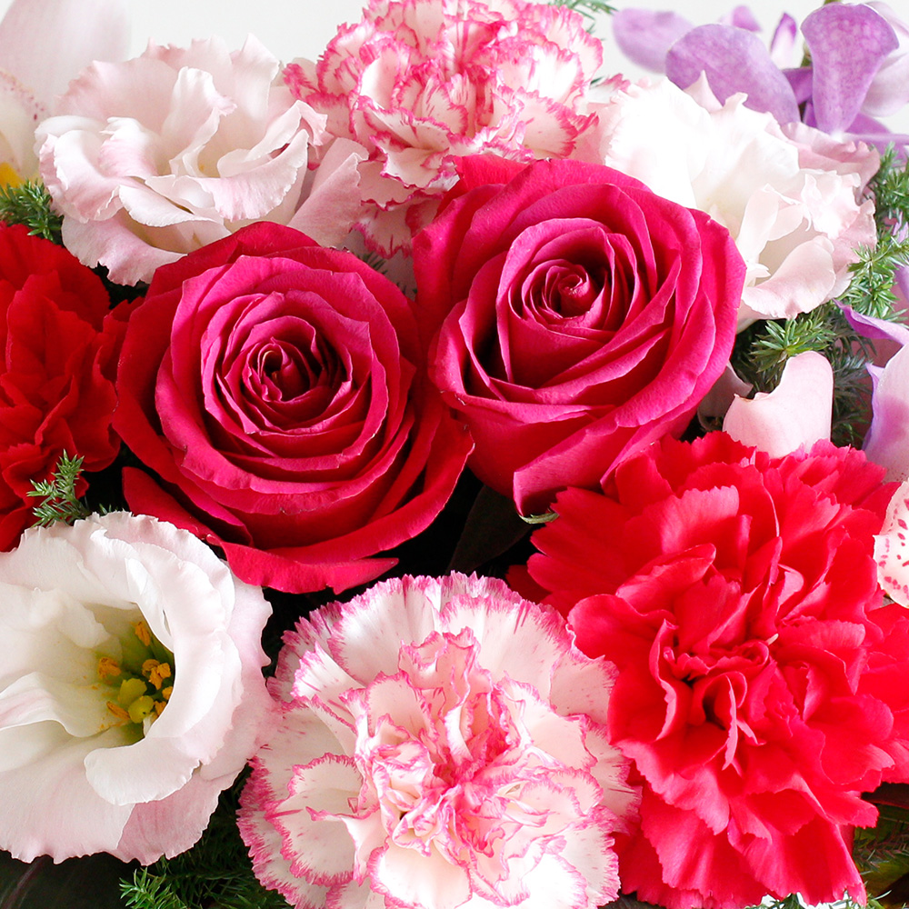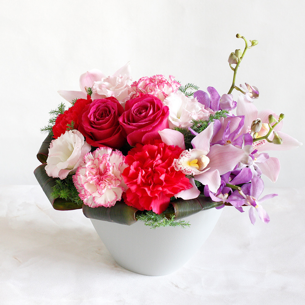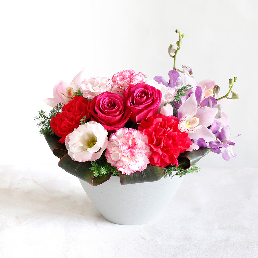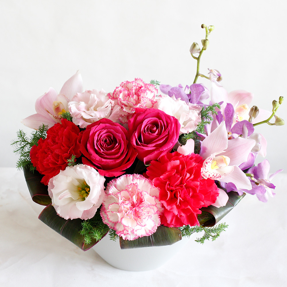鮮やかなピンクのバラを中心に、濃淡さまざまなカーネーションやトルコキキョウを組み合わせ、優雅で上品な雰囲気に仕上げたアレンジメントです。アクセントで添えられたモカラが華やかさを引き立て、あでやかに咲き誇るピンクのシンビジウムが高級感を添えています。