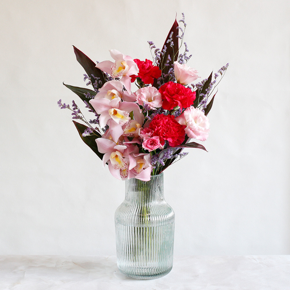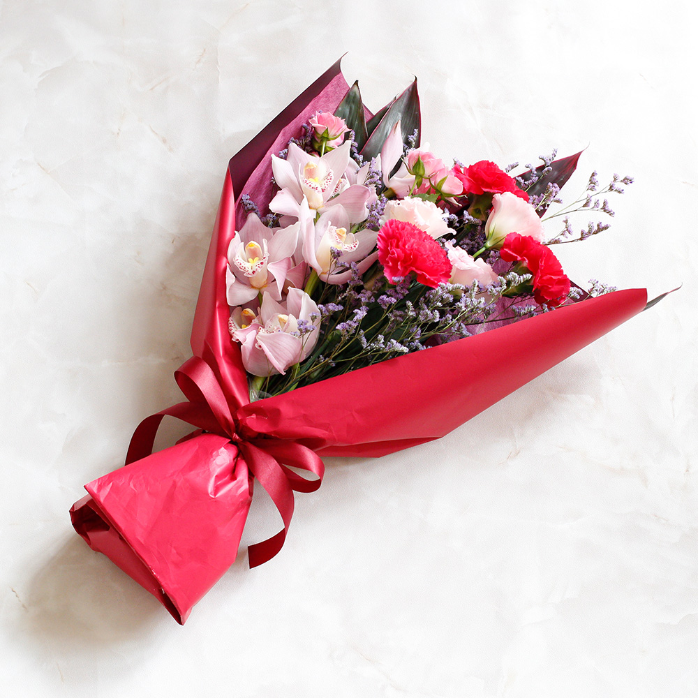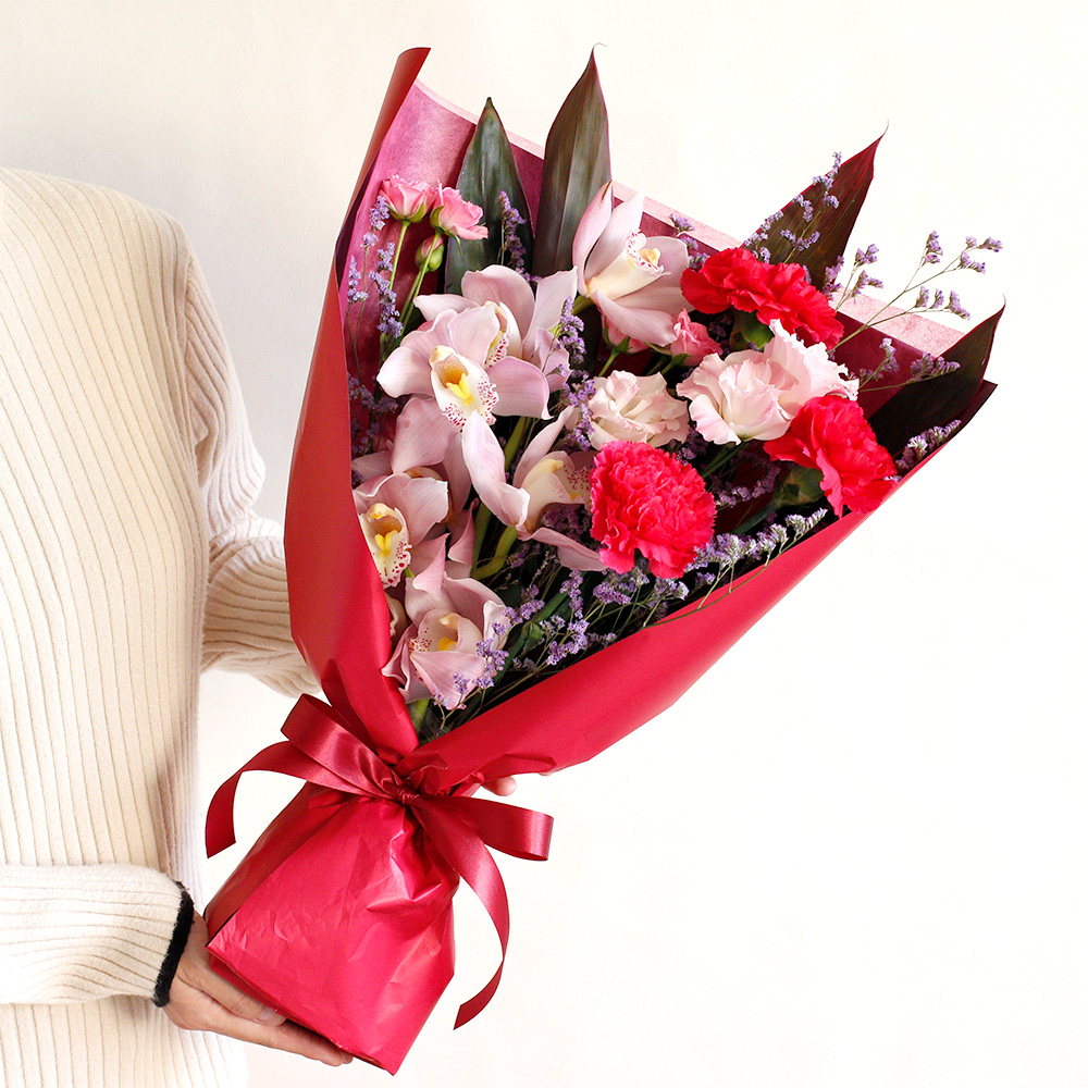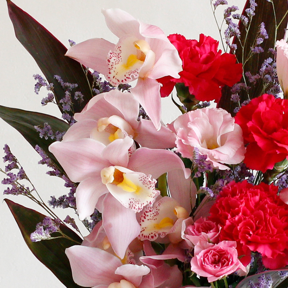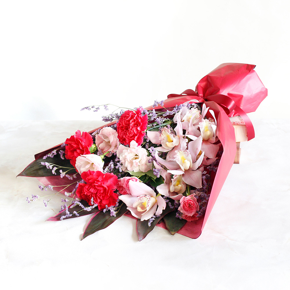 ピンクのシンビジウムを主役に、濃淡さまざまなスプレーバラや、カーネーション、トルコキキョウを組み合わせた優雅で上品な花束です。ピンクのシンビジウムは「上品な女性」という花言葉を持ち、華やかで凛とした存在感が花束全体を引き締め、大切な方への想いをやさしく伝えてくれます。