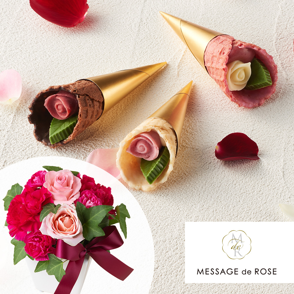 “愛と美の象徴である薔薇の美しさをチョコレートで表現し、メッセージを込めたい”との想いから1989年に誕生したメサージュ・ド・ローズ(薔薇に込めたメッセージ)より「TOKYOコーン・フルーリ」をお届けします。コーンの中には可憐な薔薇のつぼみとリーフが入っていて、まるで小さな花束のような商品です。