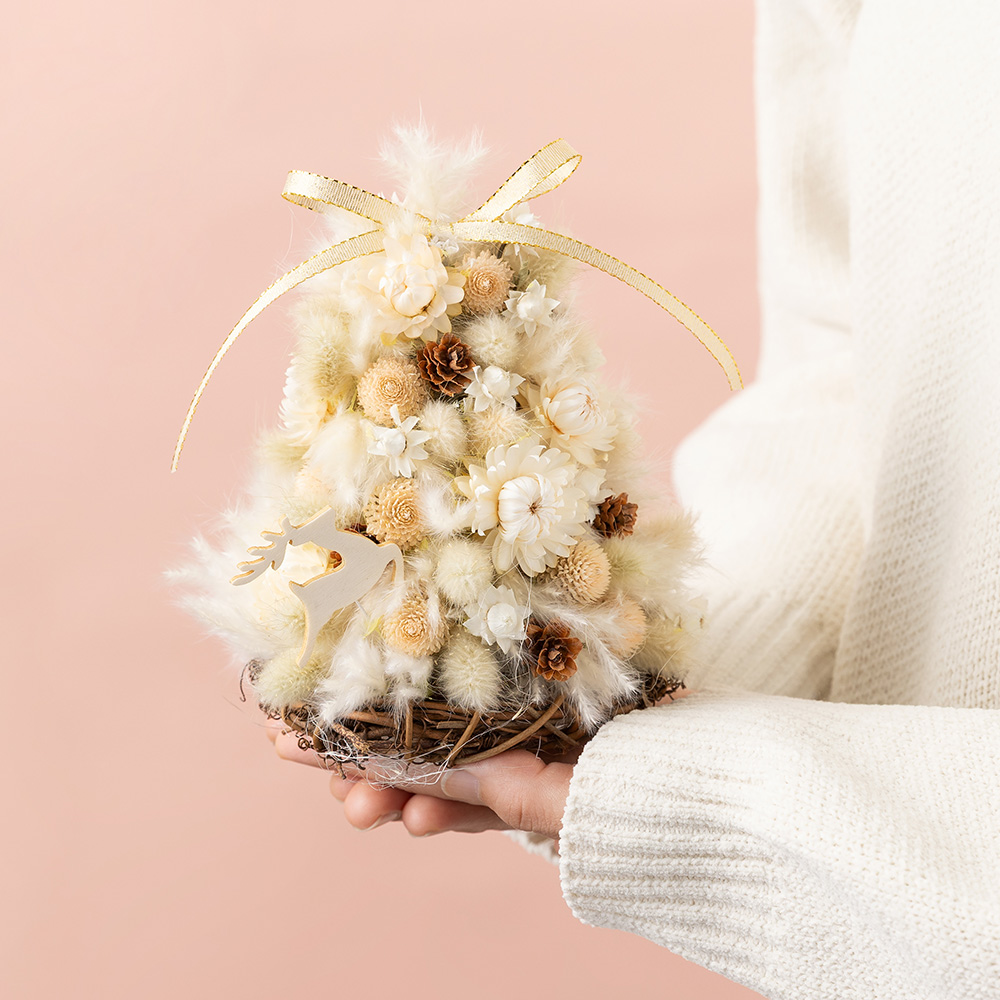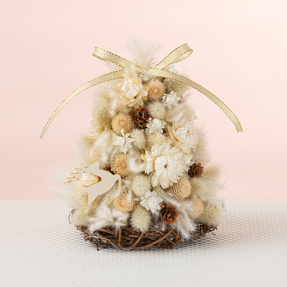 ふわふわとしたニュアンスカラーのテールリードやラグラスが目を惹く三角錐型のツリーアレンジです。雪山を駆け上がるようなイメージのトナカイのシルエットモチーフがクリスマス気分を盛り上げます。