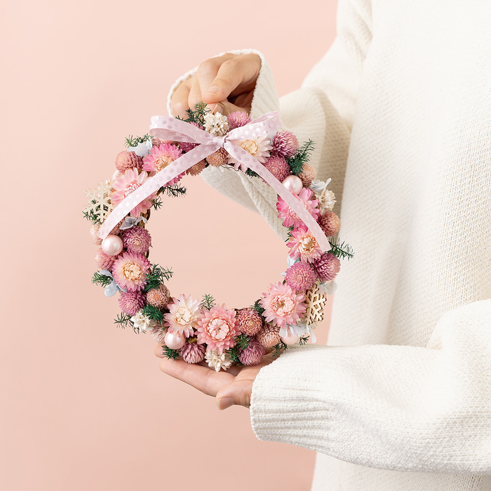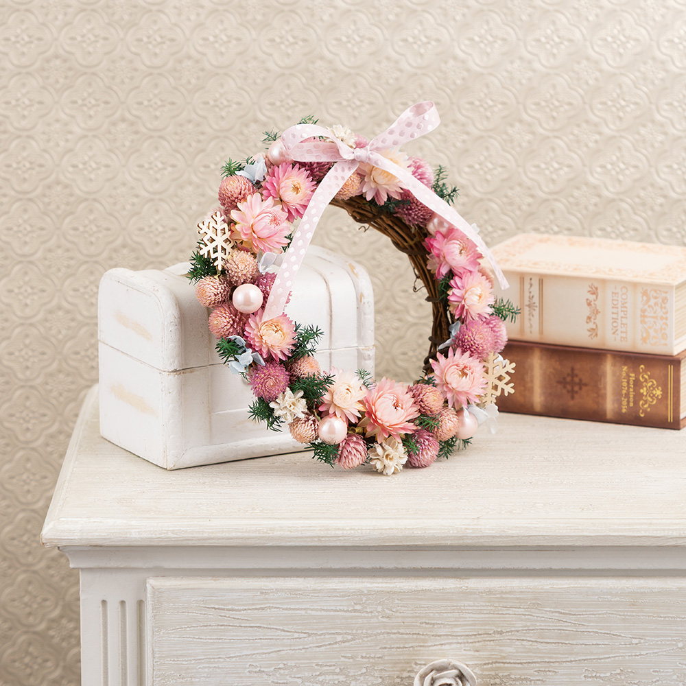 ヘリクリサムや千日紅に、プリザーブドフラワーのベイビーブルーのアジサイを組み合わせた、たくさんのキャンディーが集まったような可愛らしいクリスマスリースです。ピンクのパールの輝きが、華やかさを一層引き立て、クリスマス気分を盛り上げます。