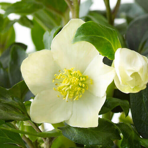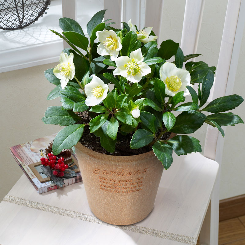 キリストの生誕を祝って咲いたと言われるクリスマスローズ。その名の通り、冬にバラのように美しい花を凛と咲かせます。中でも横向きに花をつける人気の品種の“ニゲル”をお届けします。純白の花を眺めながらクリスマス伝説に思いを馳せてみては。愛好家も多いので、お花好きの方へのプレゼントにもオススメです。お手入れのポイント