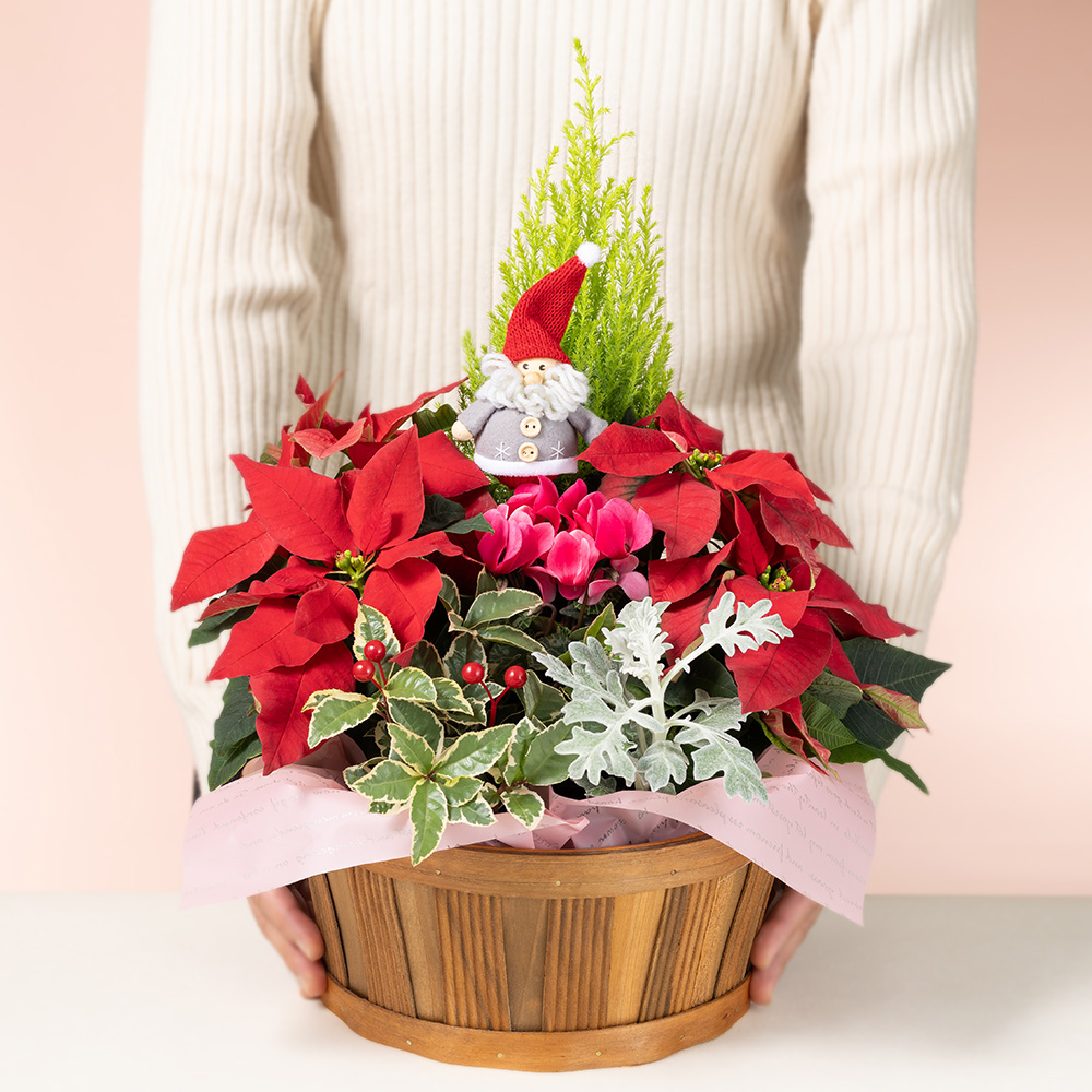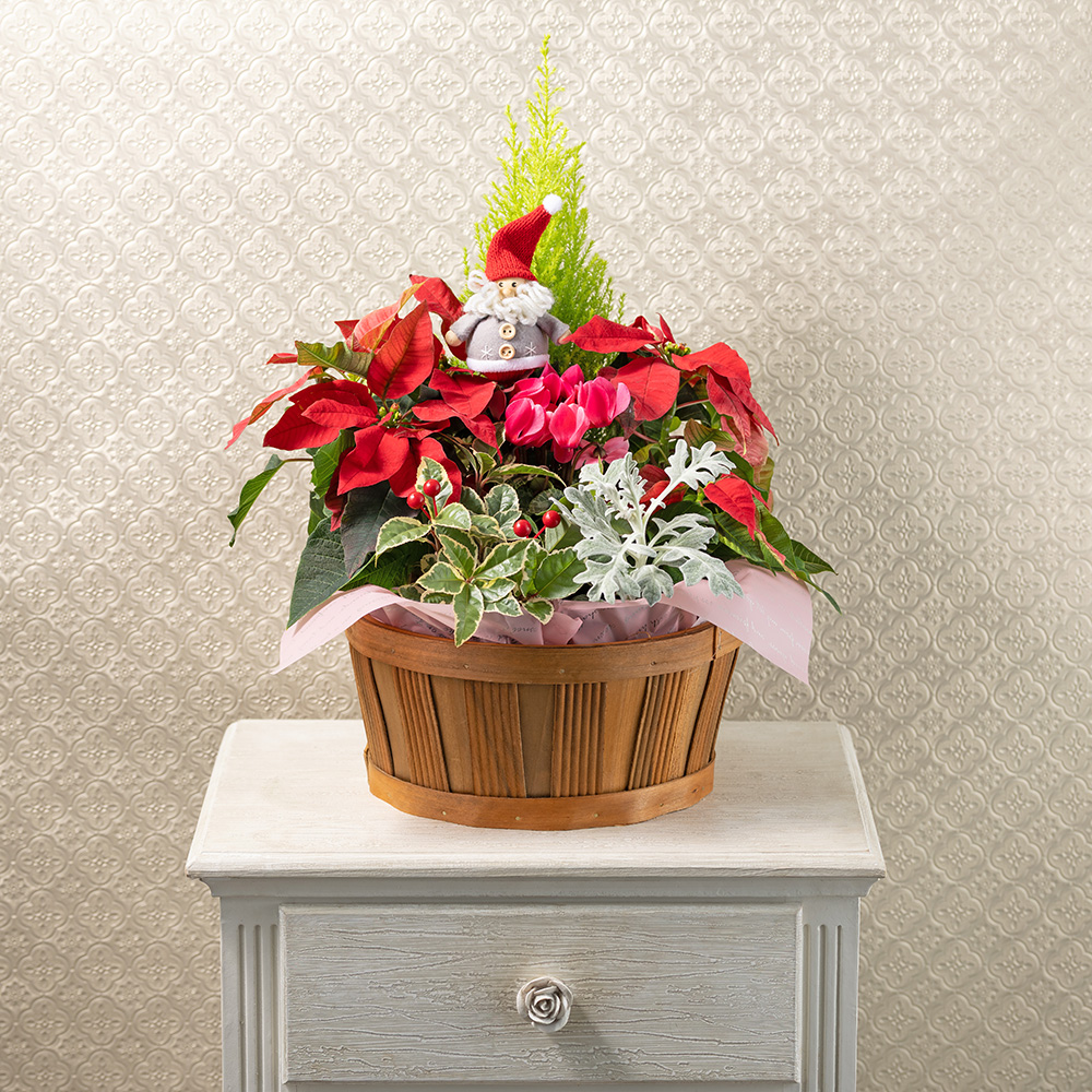 冬を代表する花々を贅沢に使ったクリスマスのアソートバスケット。クリスマスツリーに見立てたゴールドクレストを中心に、クリスマスには欠かせないポインセチアやガーデンシクラメンなどを合わせたボリューム感あふれる寄せ鉢です。雪の結晶のようなダスティーミラーをアクセントにシンプルなクリスマスカラーでまとめました。小さなサンタが植物の間からひょっこり顔を出す姿が、見る人の心を和ませます。