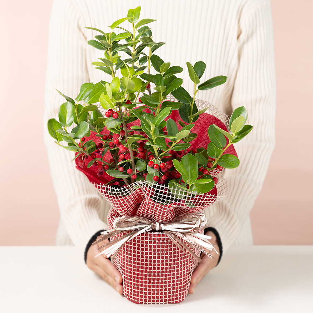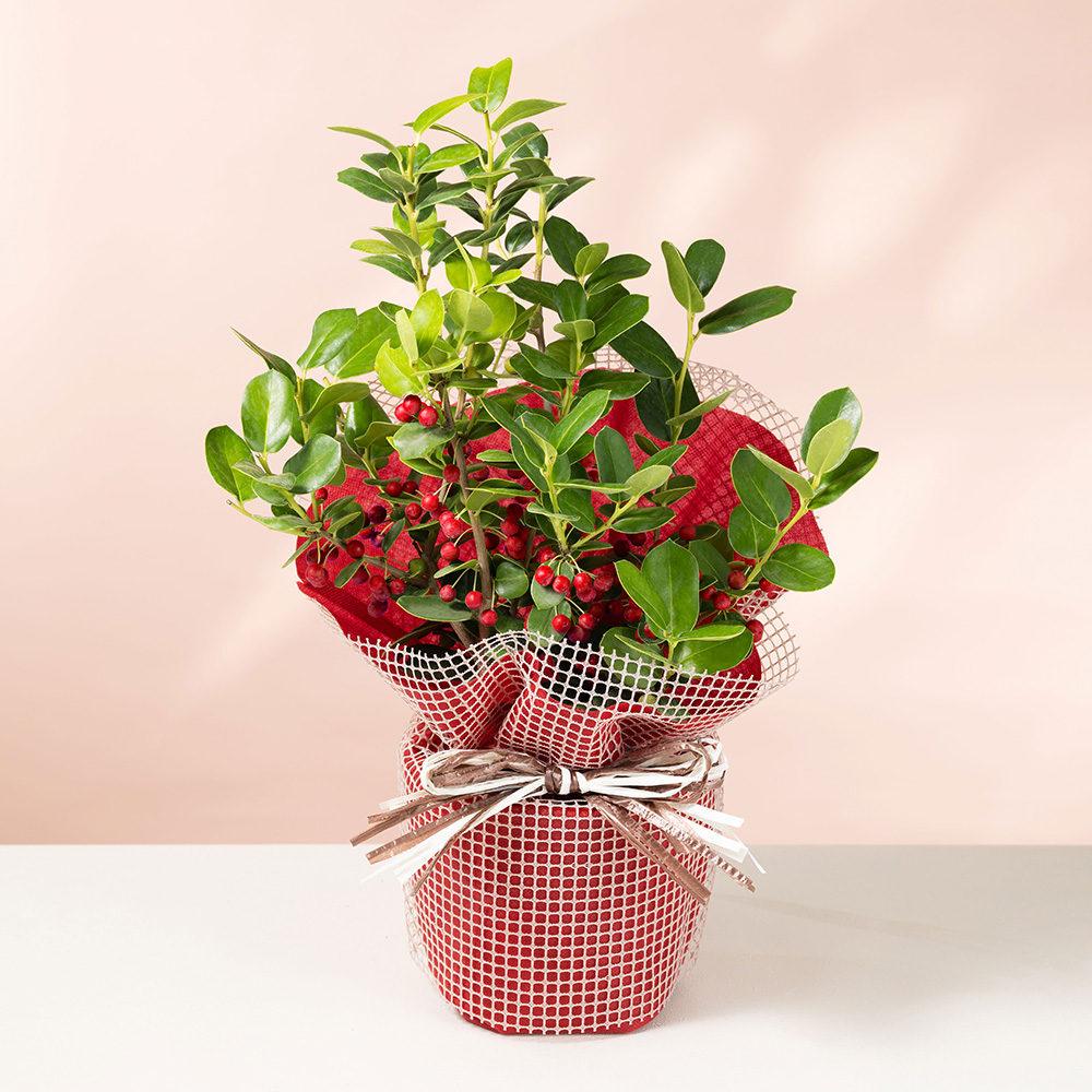 お届け時期によっては実が真っ赤になっていない場合があります。実の色の変化を愛でながら、本格的なクリスマスをお楽しみください。