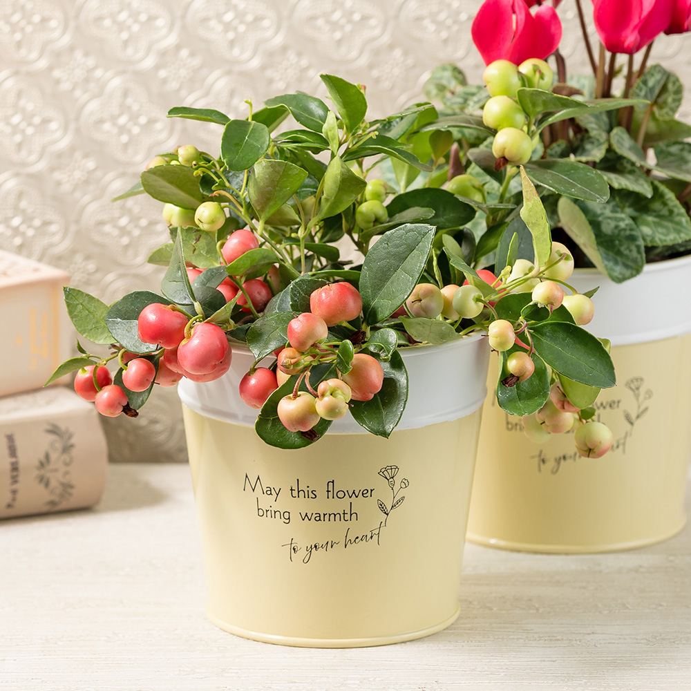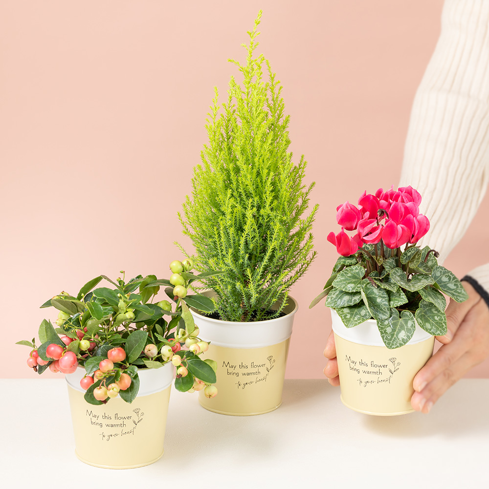 | サイズ | ゴールドクレスト:奥行き約12cm、幅約12cm、高さ約35cm チェッカーベリー:奥行き約12cm、幅約12cm、高さ約18cm ミニシクラメン:奥行き約12cm、幅約12cm、高さ約20cm 各重量約1000g |