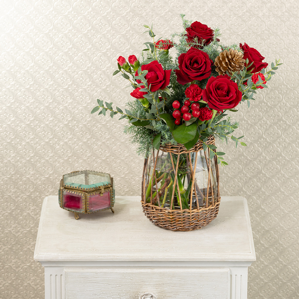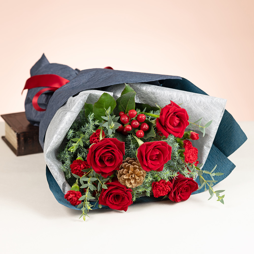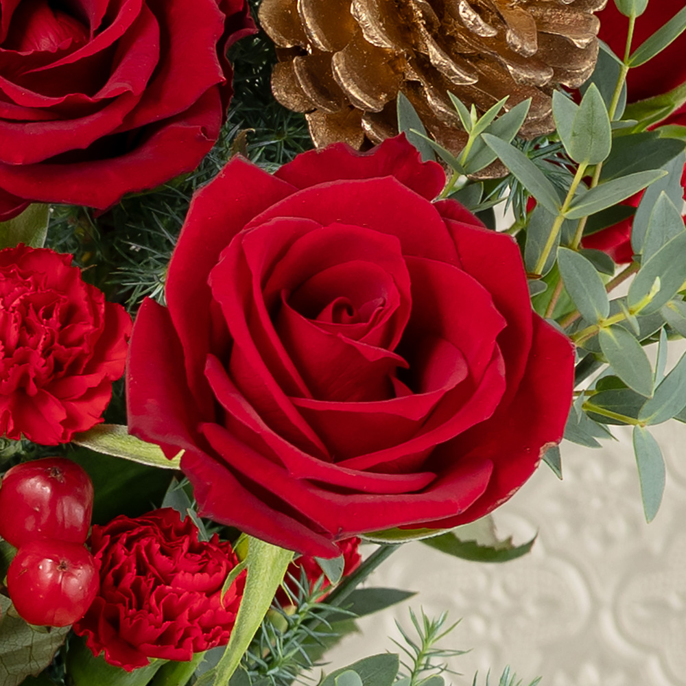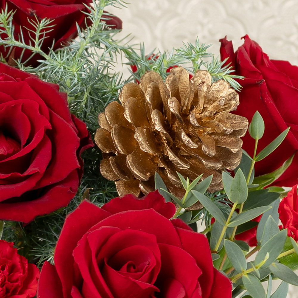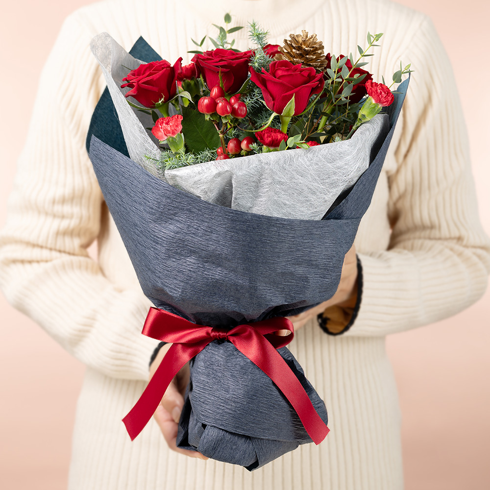 深紅のバラをメインに、同系色の赤い花々を合わせた、華やかで気品あるクリスマスブーケです。鮮やかな赤の中にきらめくゴールドのマツカサがアクセントとなり、冬の特別なシーンをより一層引き立てます。