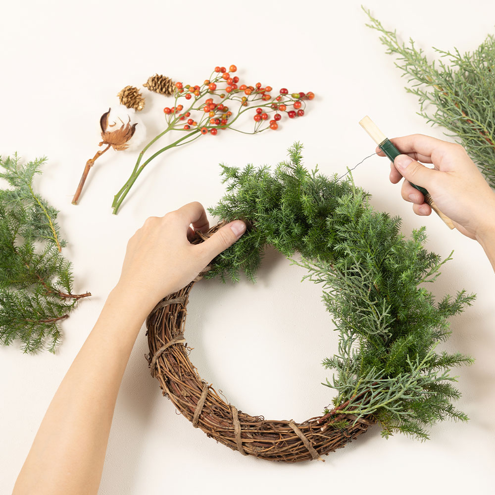 フレッシュなグリーンを使ったクリスマスリースの手作りキットです。ヒムロ杉やブルーアイス、バラの実やコットンフラワーなど、季節感あふれる素材を組み合わせて、自分だけのオリジナルリースを作ることができます。