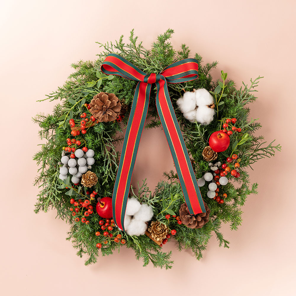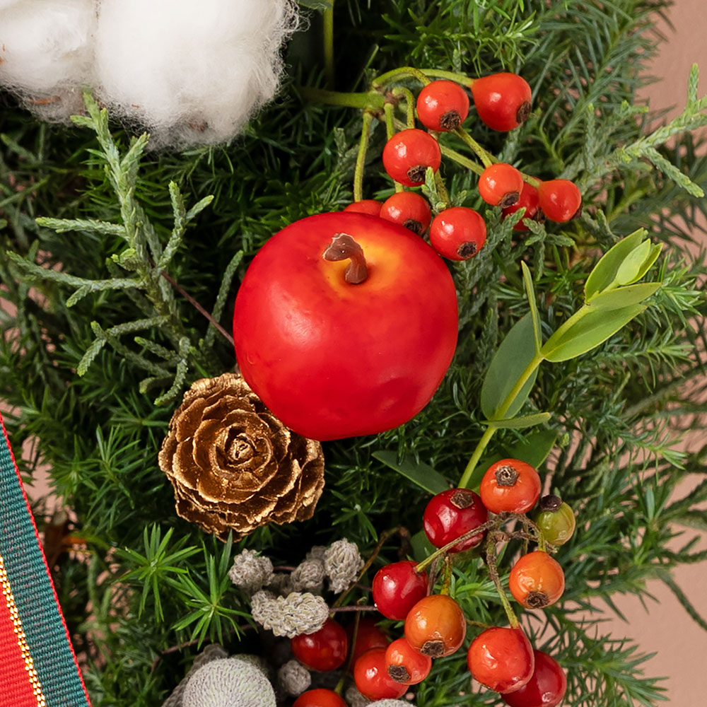 | 資材 | マツカサ2個、カラマツ(ゴールド)3個、シナモンスティック2個、リースベース(直径約25cm、)、リンゴピック(フェイク )2本、リボン、地巻きワイヤー、お手入れ説明付き |