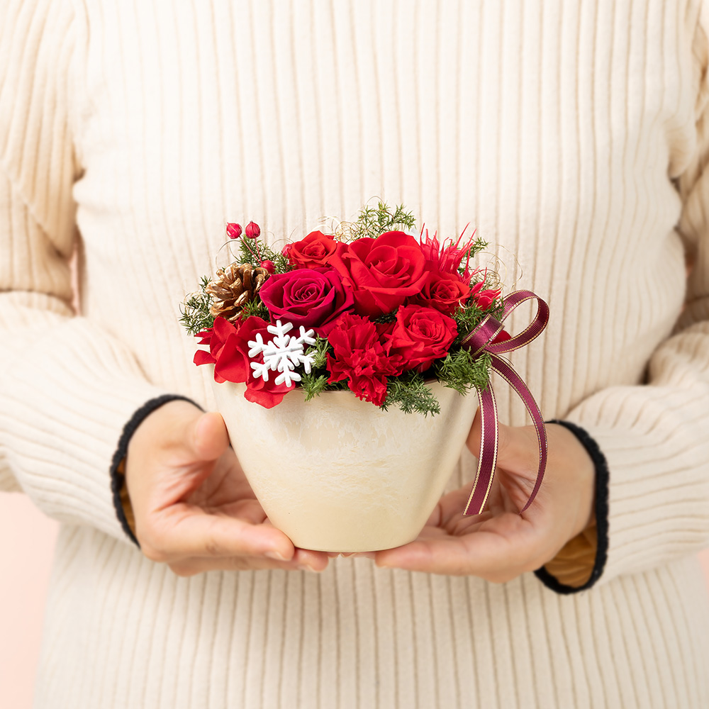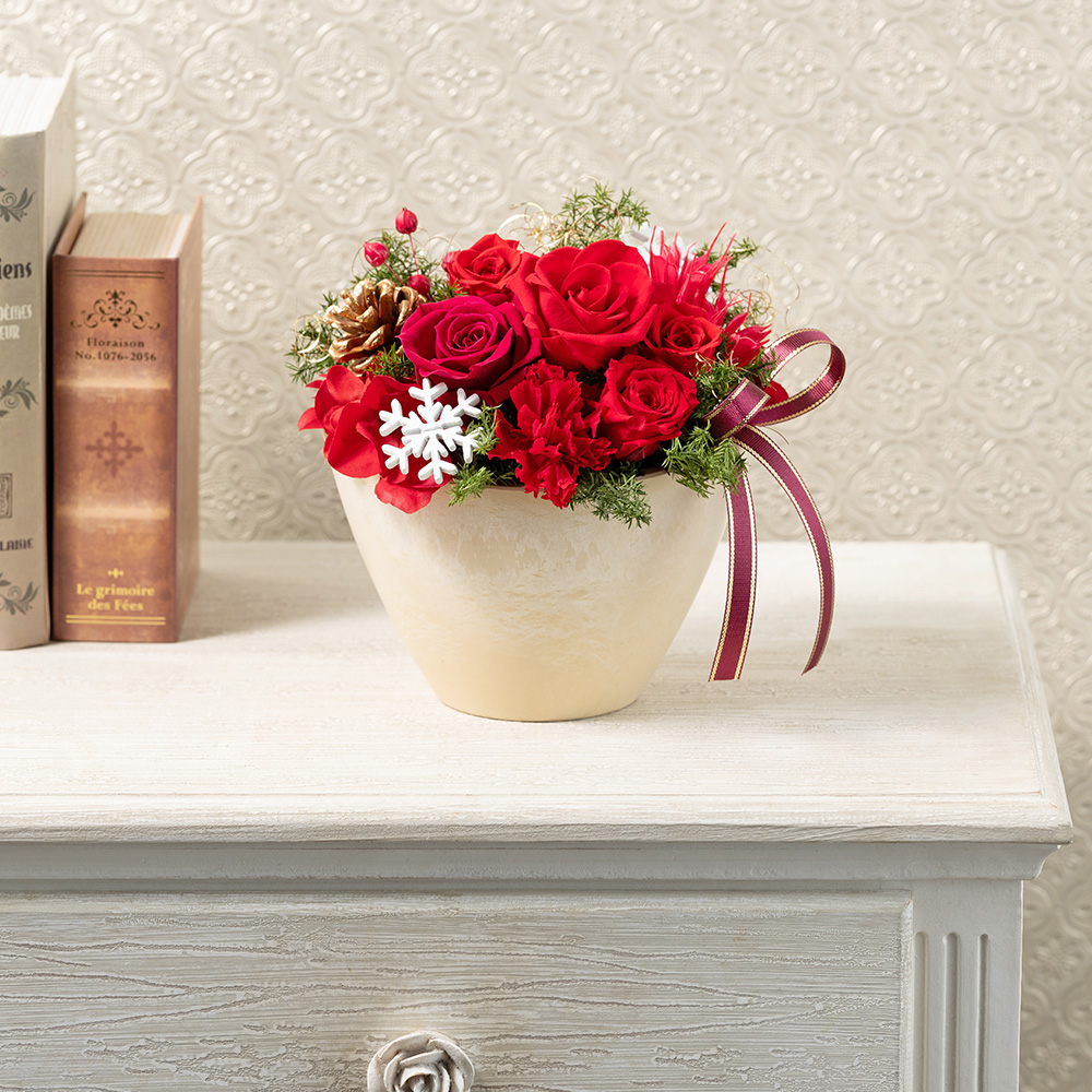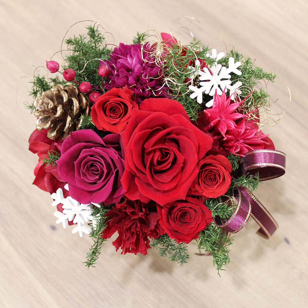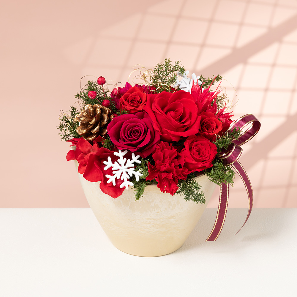 深紅のバラをふんだんに使った、上品なプリザーブドアレンジメント。雪の結晶や、キラキラとしたゴールドカラーのアイテムを組み合わせた、華やかで大人っぽい仕立てです。