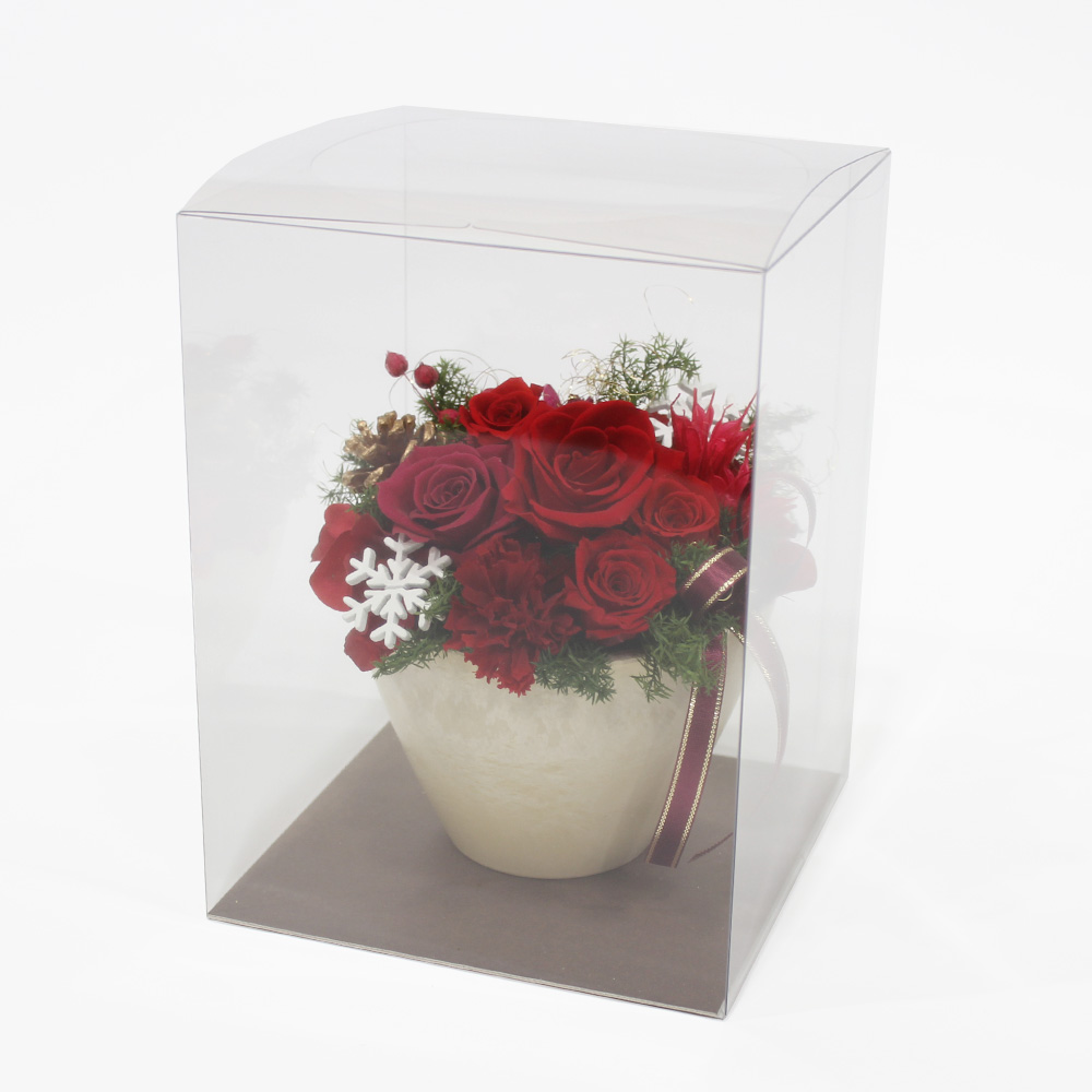| 資材 | 雪の結晶オーナメント、リボン、カールワイヤー、樹脂製花器、クリアケース入り、お手入れ説明付き |