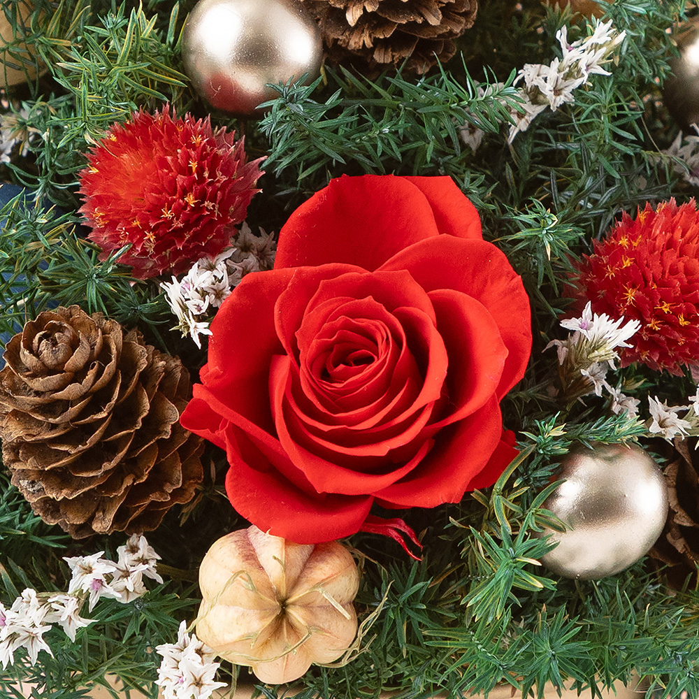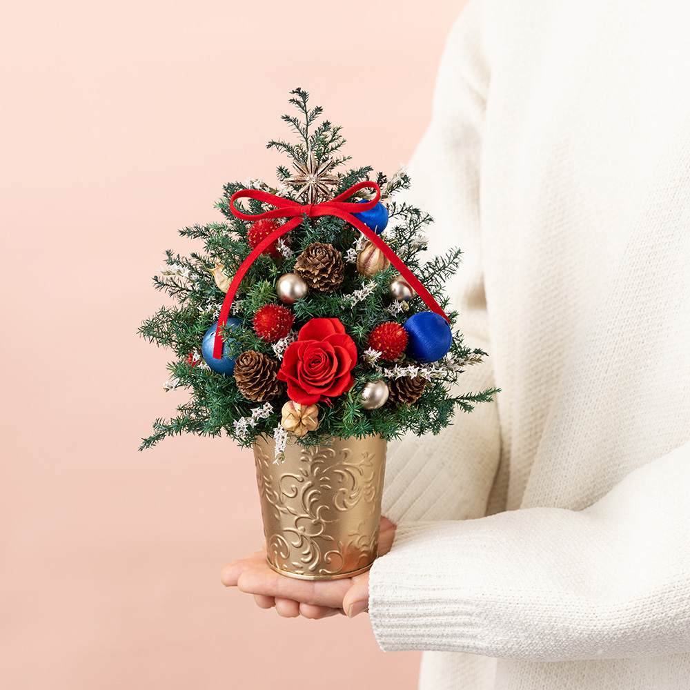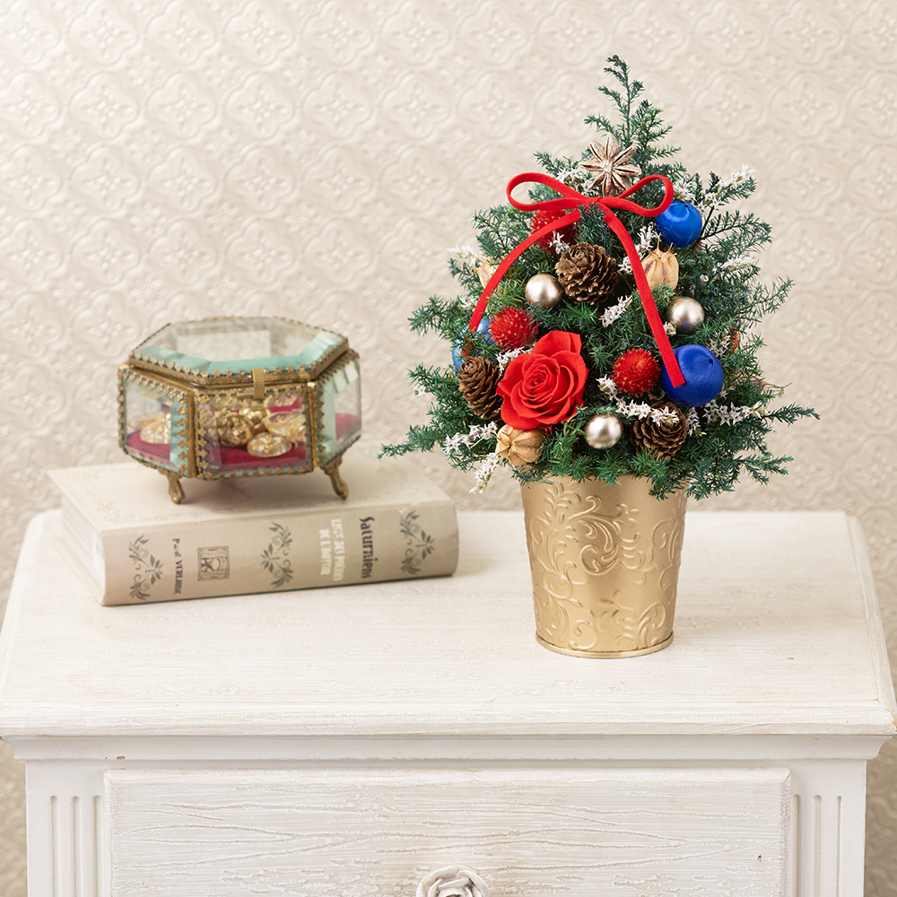 クリスマスらしいゴールドの花器に、プリザーブドフラワーの赤バラやセンニチコウ、木の実、華奢なリボンをバランス良く飾ったツリーアレンジは、どんなお部屋にも気軽に飾れてクリスマスムードを高めてくれそうです。