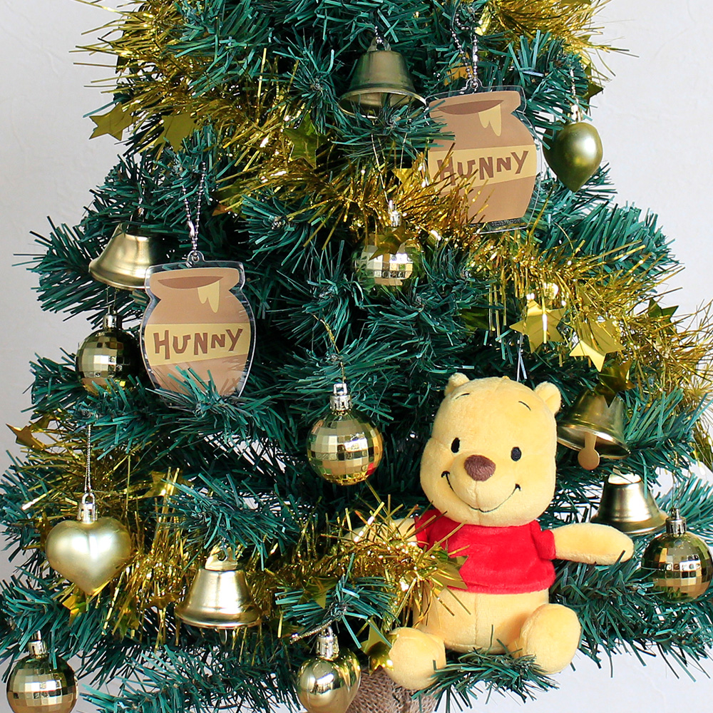 飾りやすい卓上サイズで、約60cmと使いやすいツリーとオーナメントのセットです。リビングなどに飾っていただいても場所を取らずいいですね。可愛らしい表情のくまのプーさんデザインのぬいぐるみとプーさんの大好物のはちみつが入ったハニーポットデザインのキーホルダー、ハニーカラーのキラキラオーナメントを合わせたハニーツリーです。おいしそうなハニーツリーと愛嬌たっぷりのくまのプーさんデザインのぬいぐるの組合せはみんなを笑顔にしてくれるでしょう。